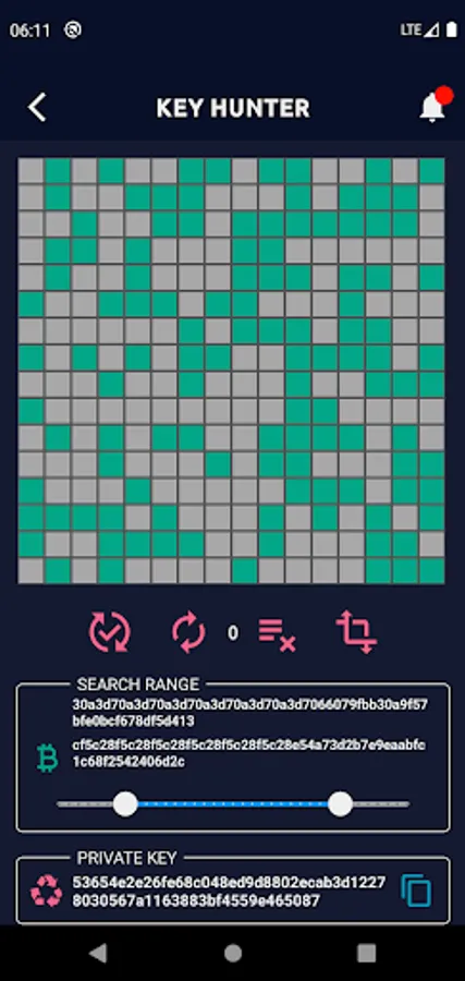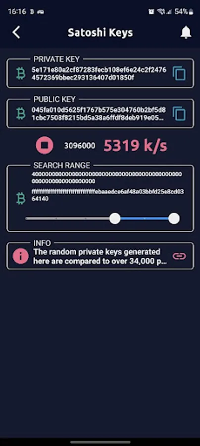 - search private for "Satoshi" public keys. The random private keys generated here are compared to over 34,000 public keys that hold 50 bitcoins each. If there is a match, a notification will come and the keys will be saved to the database. You can see them in the notifications in the upper right corner.
