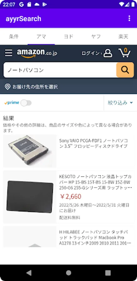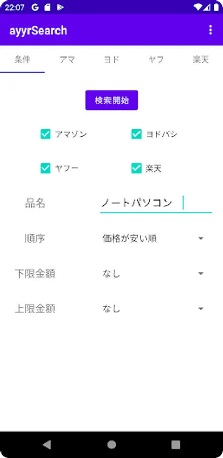 I always shop at Amazon and Yodobashi, but to search under the same conditions, I use the search screen.