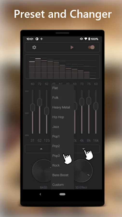 You can get the sound quality you want just by starting the music player from the playback button of this app and changing the settings of bass boost, virtualizer, and equalizer. You can change the sound quality of music players, audio players, videos, music streaming apps, radio apps, etc. (*1)