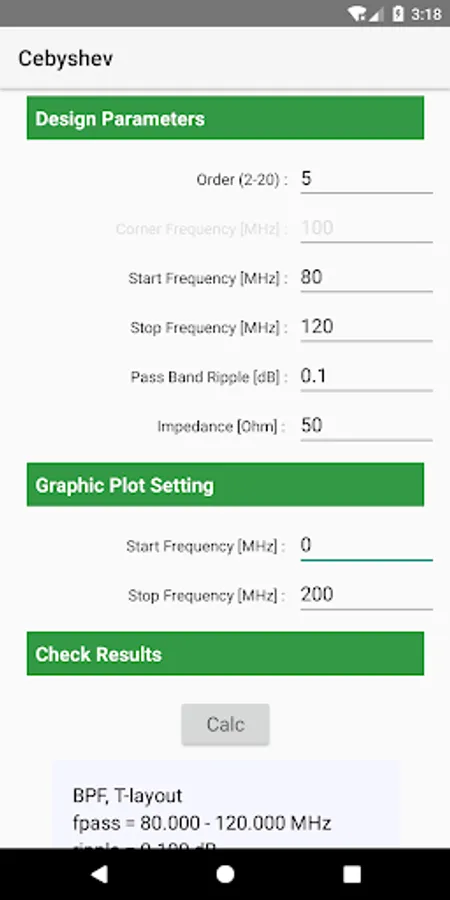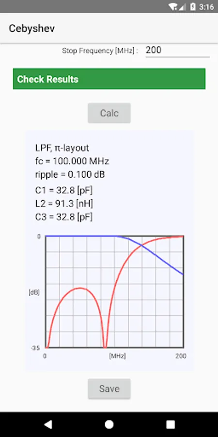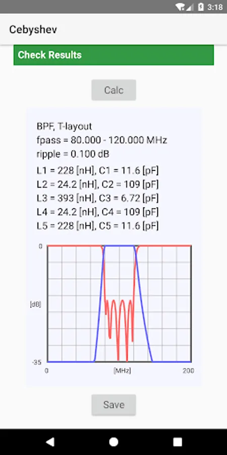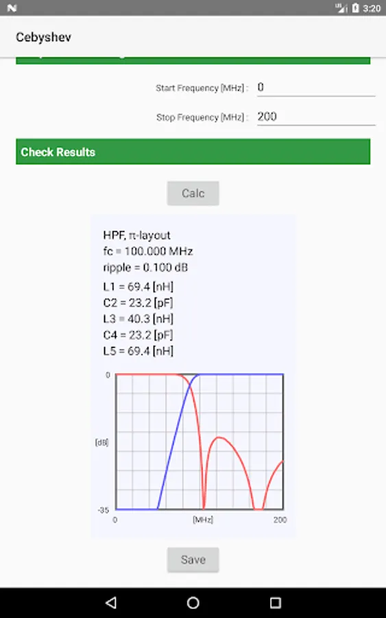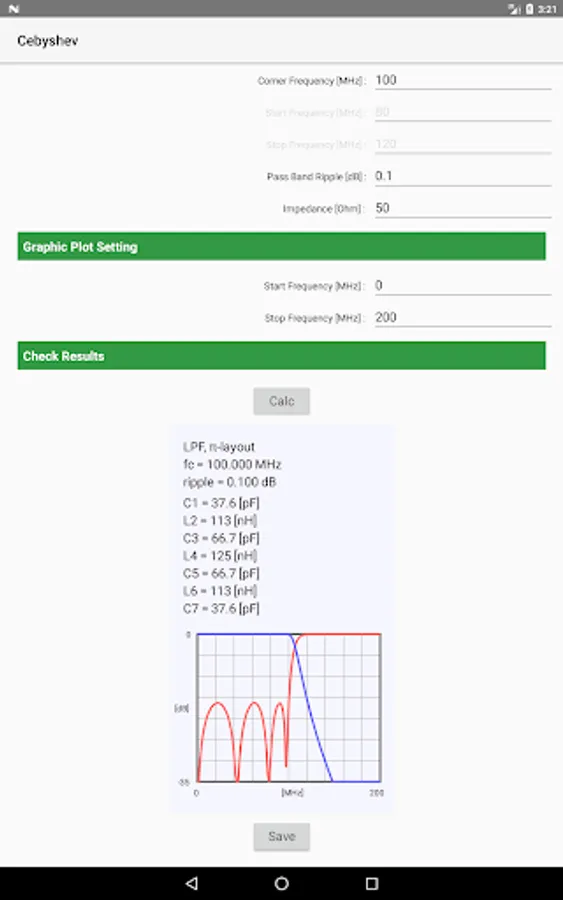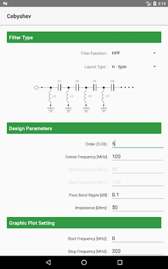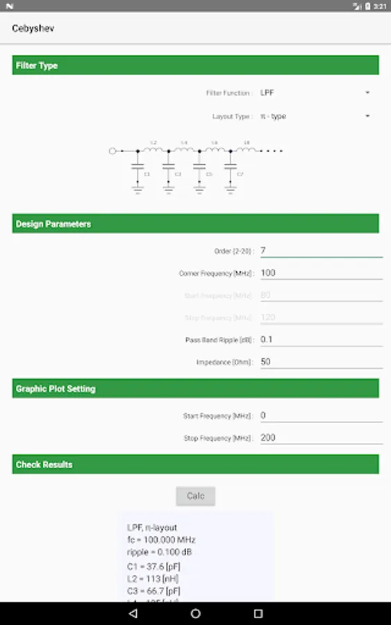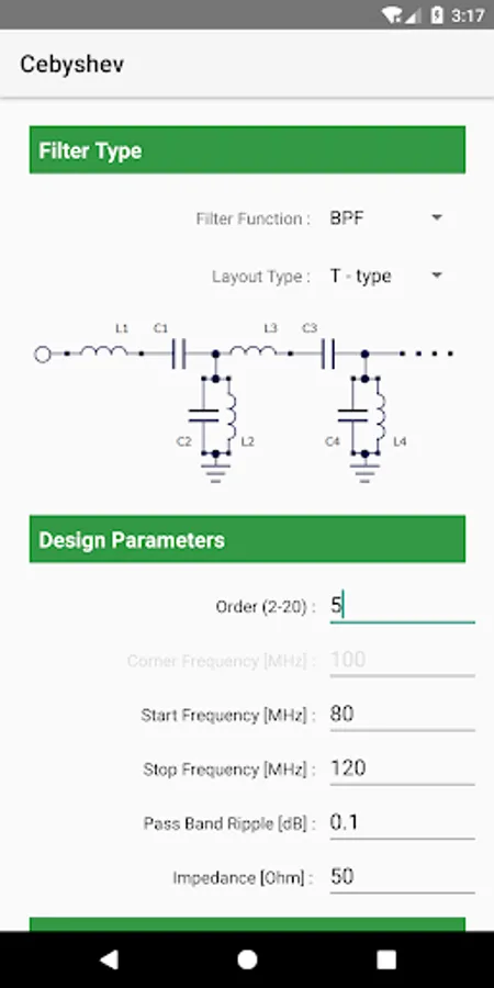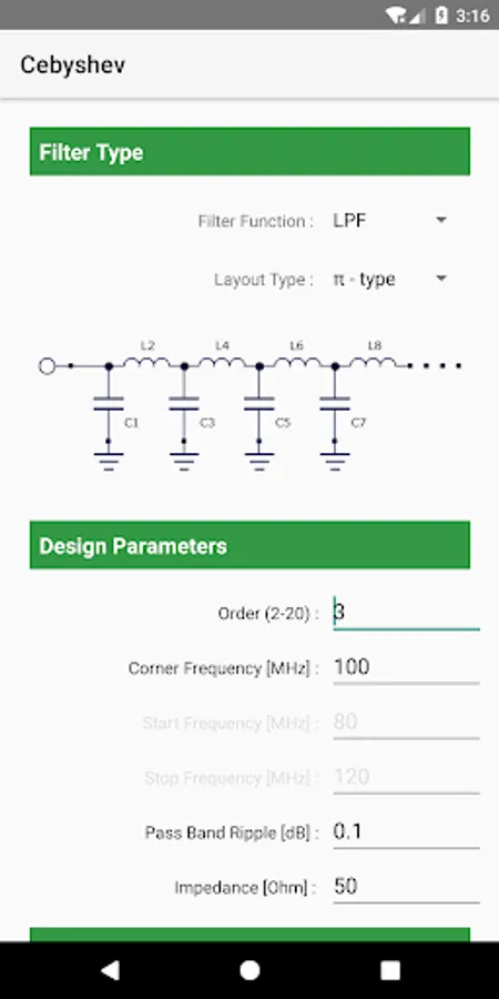 This app designs the Chebyshev LC filters (LPF, HPF, BPF) according to various parameters.