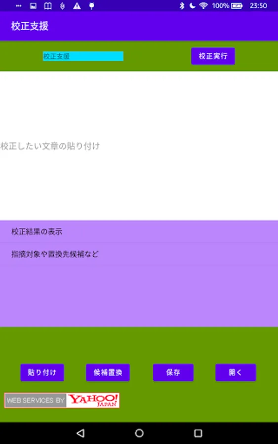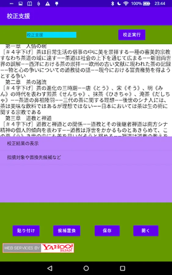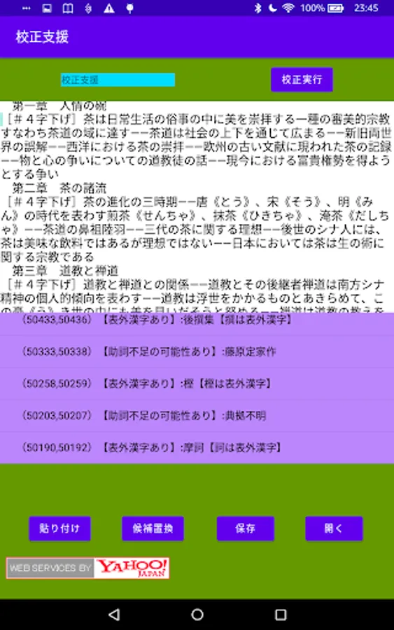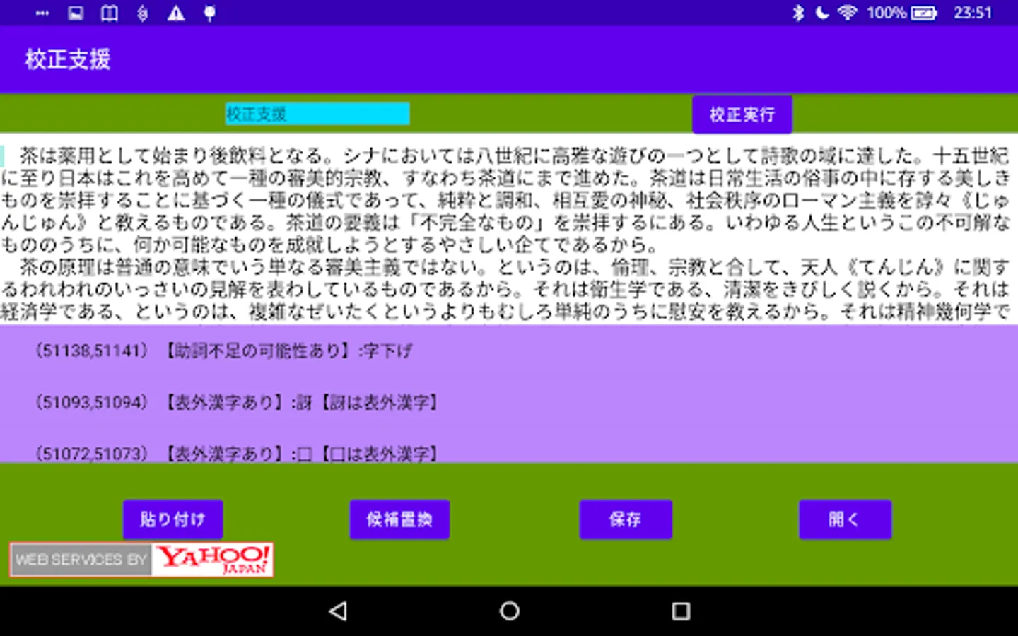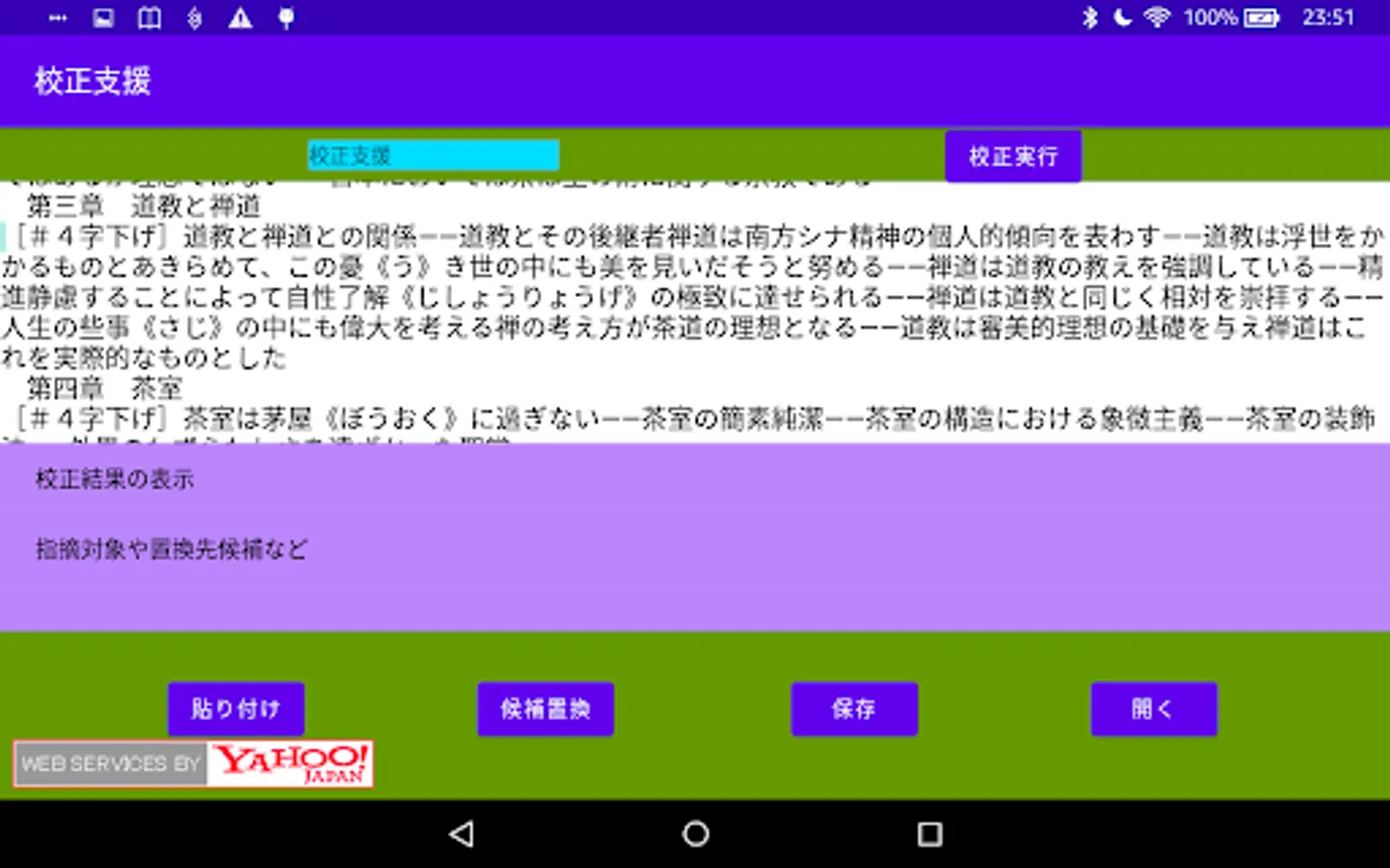 Paste the text you want to proofread in the upper text area and press the proofreading execution button, and the proofreading result will be displayed in the list view below. Tap the calibration result to select the text that indicates the calibration result. If there are proofreading candidates, press the "Replace Candidate" button to replace them with proofreading candidates.