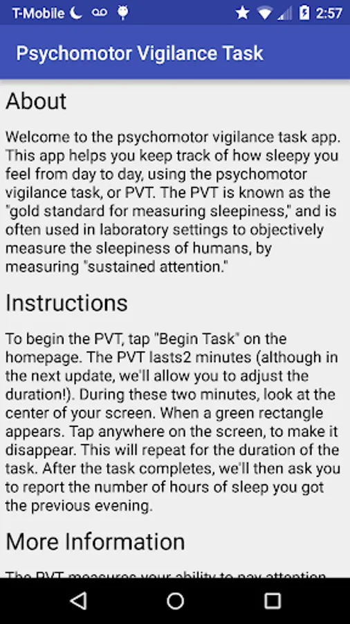 Psychomotor vigilance task (PVT), is the "gold standard" of measuring sleepiness. The PVT measures your sustained attention using a short, 2-minute task. You can log your performance over time, and see how your PVT performance changes compared to how much sleep you receive.