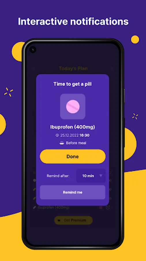 Convenient notification system will inform that you need to take and if, for some reason, you cannot take a pill right now, it will remind you after selected time.