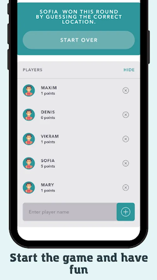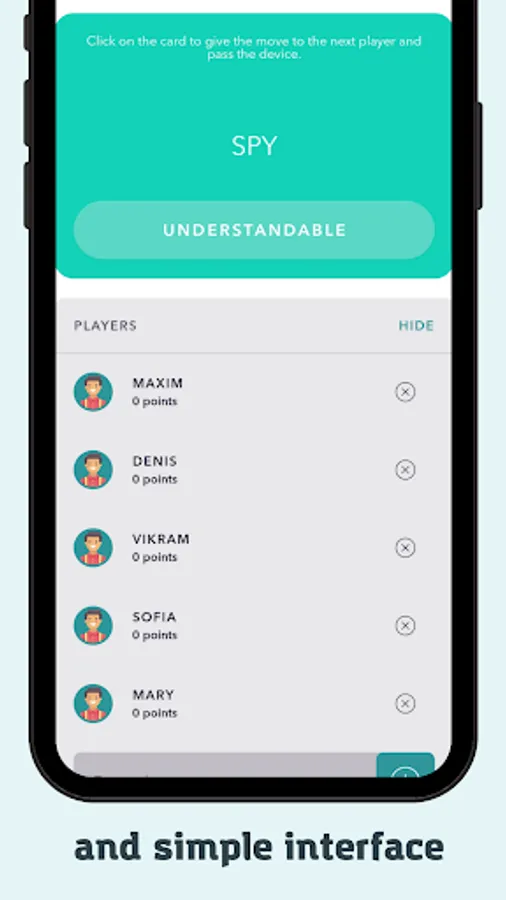 After adding all the players and pressing the "START GAME" button, the players in turn turn over the card with their name by clicking on the card. When the player sees the hidden location or the inscription "SPY", he turns his card back and passes the phone to the next player. After all players have completed these steps, the game begins.