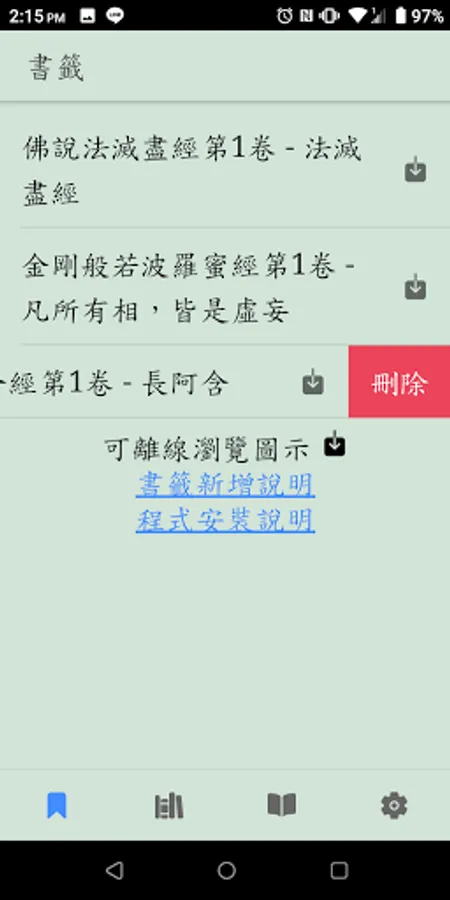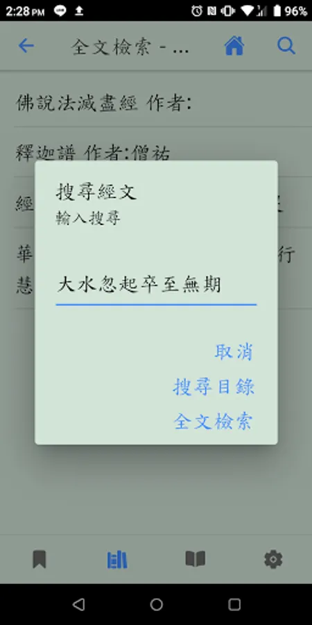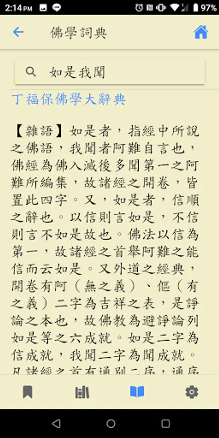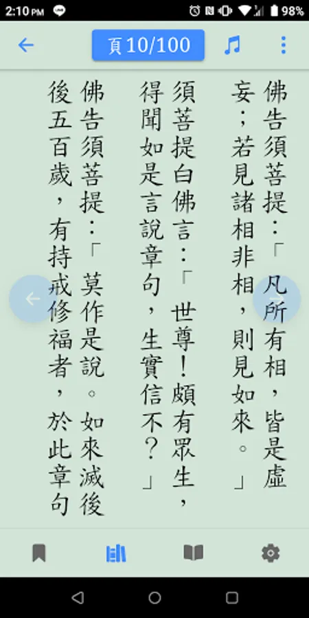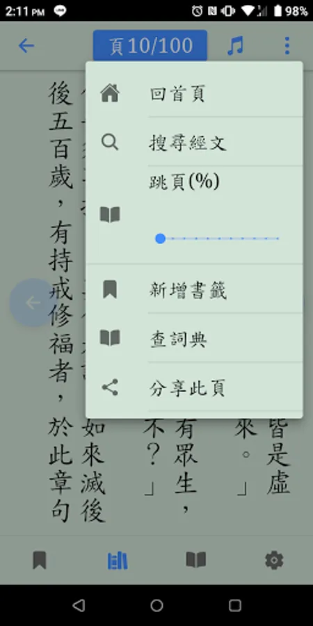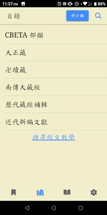 Search catalog, full-text search, bookmark function, URL sharing, offline browsing, voice playback, Buddhist dictionary, theme switching, scripture paging, font adjustment, regular script font, vertical text, app update, cross-platform, no ads, Open source code.