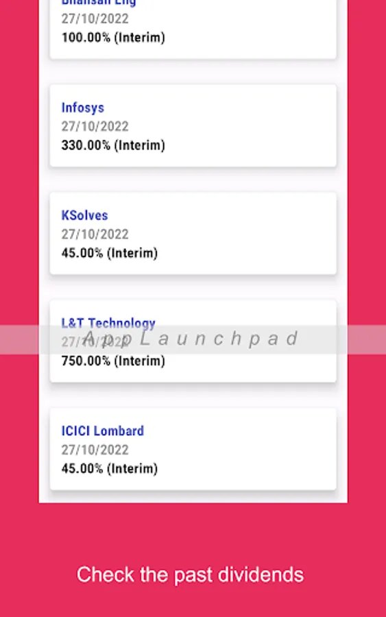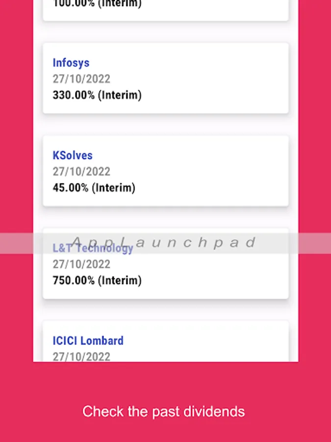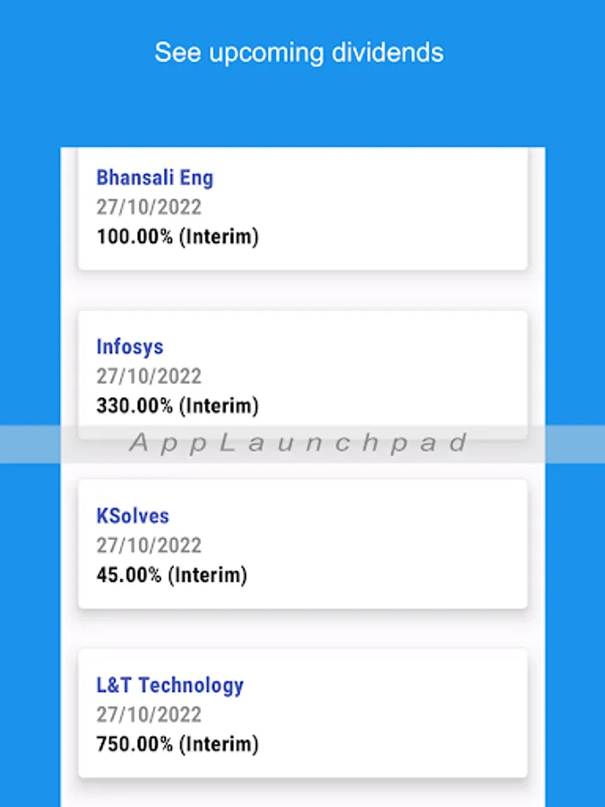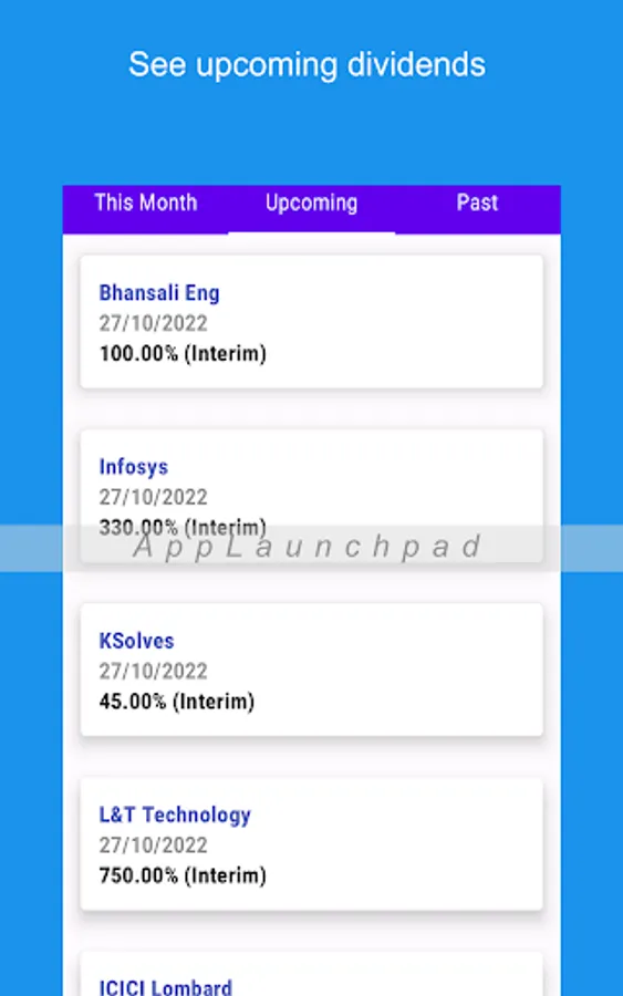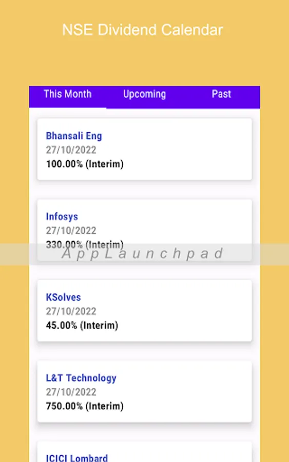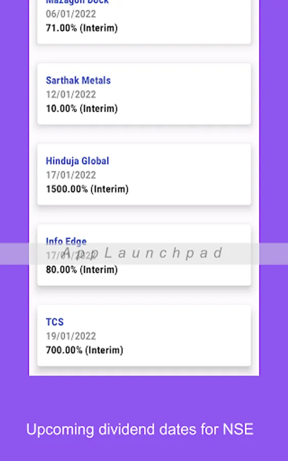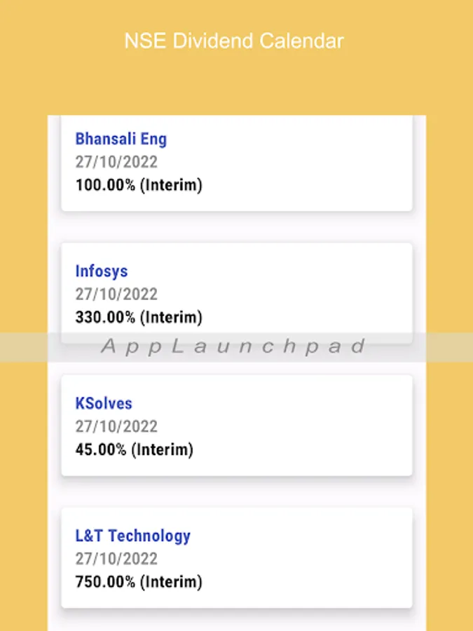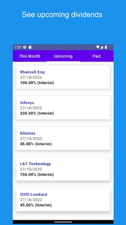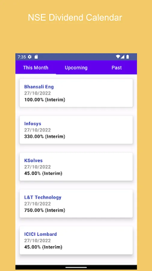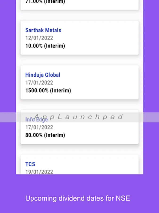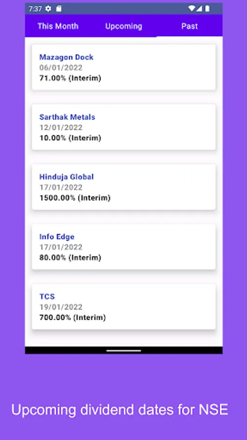 An app which shows upcoming dividend dates nse. You can view past dividend dates, upcoming dividends and dividends which will be provided for this month.
