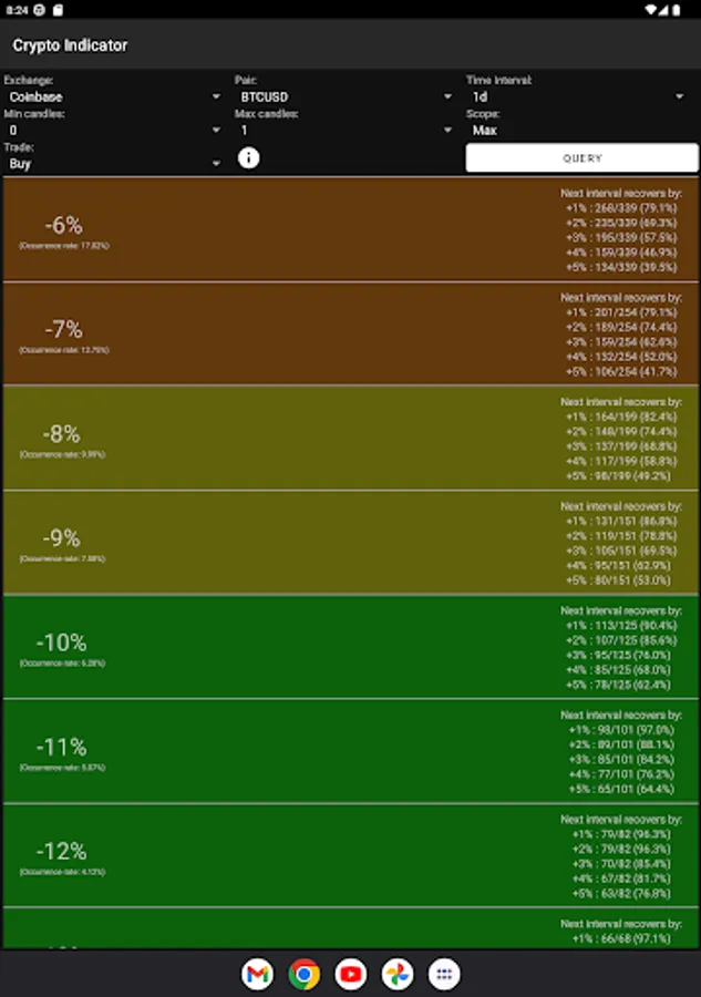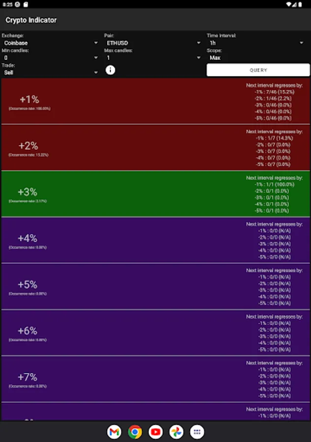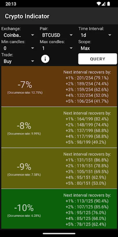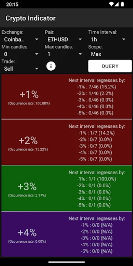 - The results are shown below the configuration options. Each row represents 1% of price movement, showing you its occurrence rate (how frequently the price drops or increases by this amount) as well as the probability of price movenment reversal in the next time interval(s).