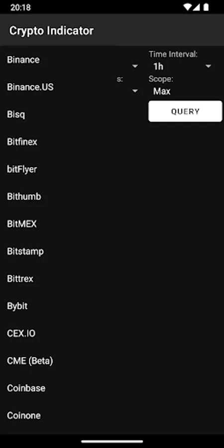 - Set the exchange and trading pair to the asset you're planning on trading, and optionally configure a custom time interval, then start a query.