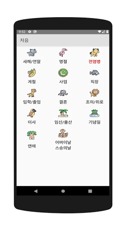 , Work, Admission/Graduation, Marriage, Condolence/Consolation, Moving, Pregnancy/Childbirth, Anniversary, Love, Mother's Day/Teacher's Day".