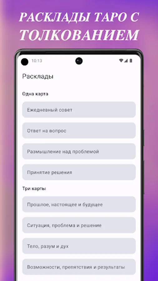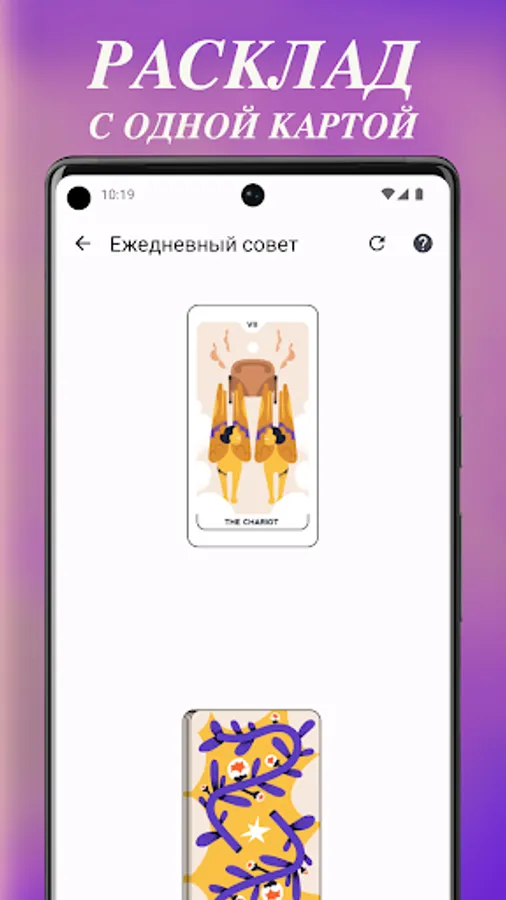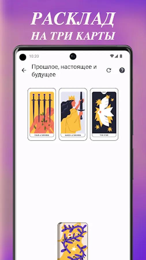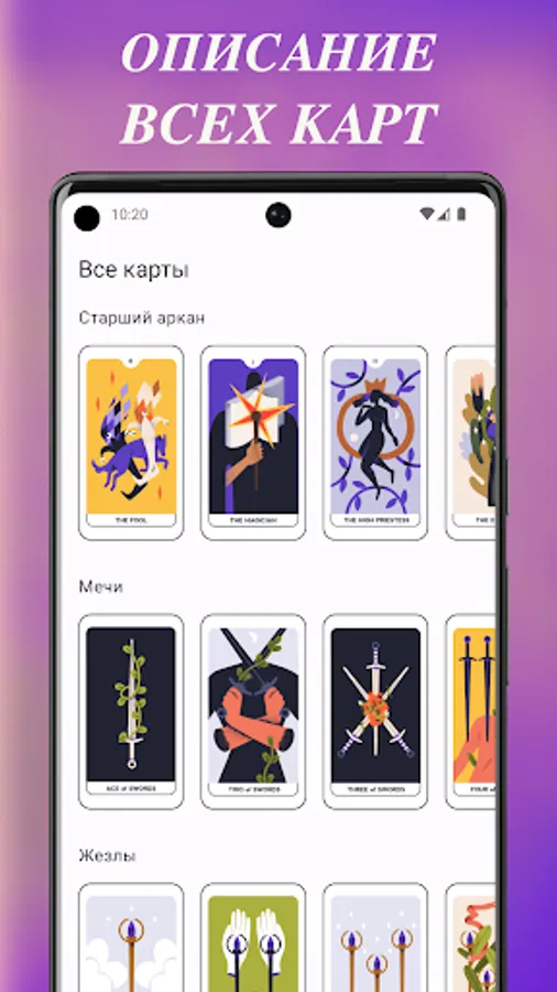 The application has the ability to view the description of each Tarot card. The intuitive interface makes it easy to find and study cards, giving you everything you need for a deep and enriching tarot card reading experience.