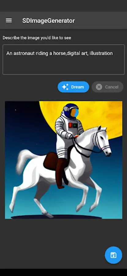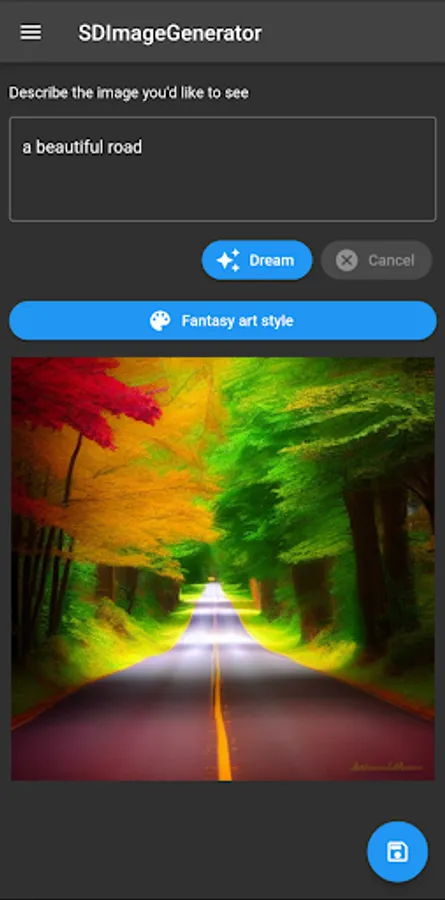 SDImageGenerator is a text to image generation artificial intelligence app. Simply describe your image for example "a fantasy landscape" and tap dream button.