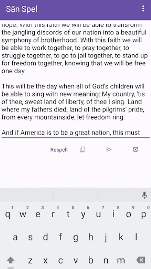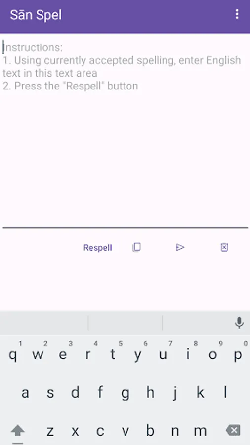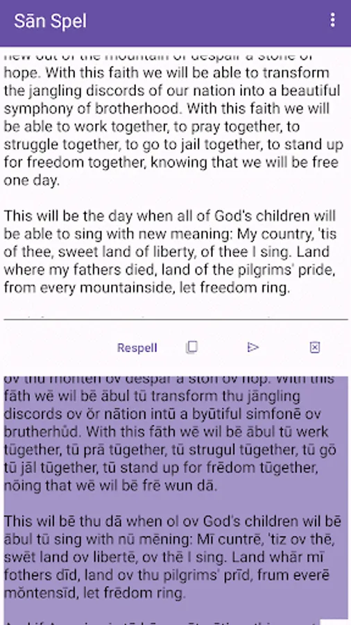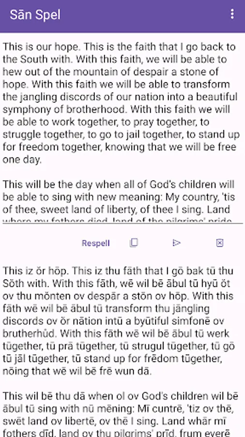 Sān Spel (Sane Spell) is a mobile app that helps users see how much easier reading, writing, and learning English would be if we revised English spelling rules. Sān Spel allows a user to enter English text with currently accepted spelling and then respells that text with rules that are much simpler and more consistent than currently accepted rules.