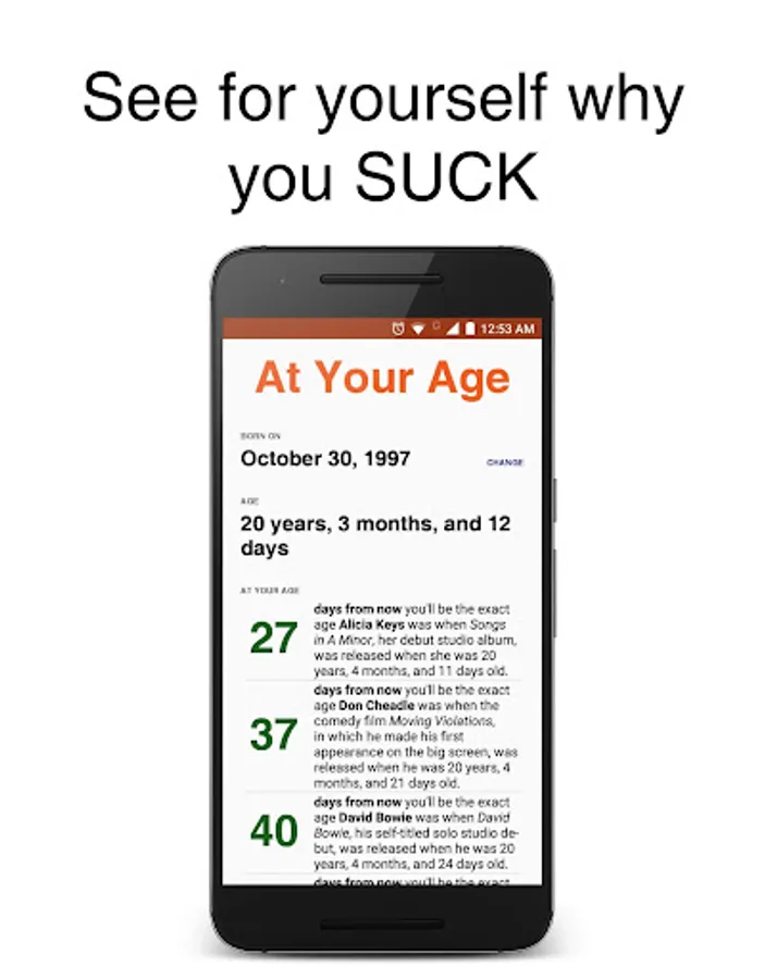 An app that is extremely tiny (700KB) that tells you what other people have achieved when they were your age. It is anti-motivational and gives you the required kick to start your day.