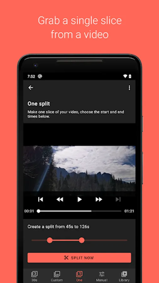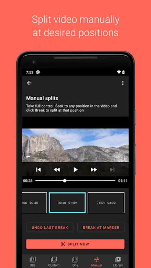 - Manual mode to split videos at desired positions.
