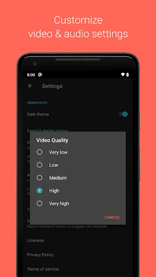 - Option to customize video and audio quality settings to fine tune either the file size or quality.
