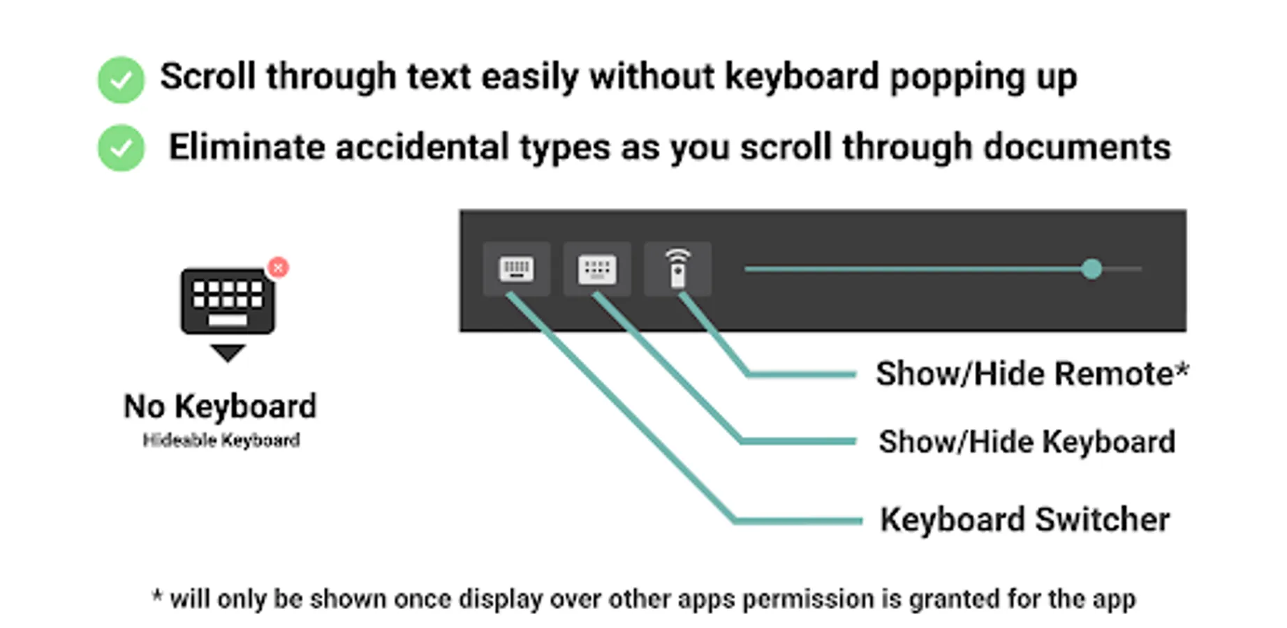 ✓ Minimise accidental types as you scroll through text easily without keyboard popping up.
