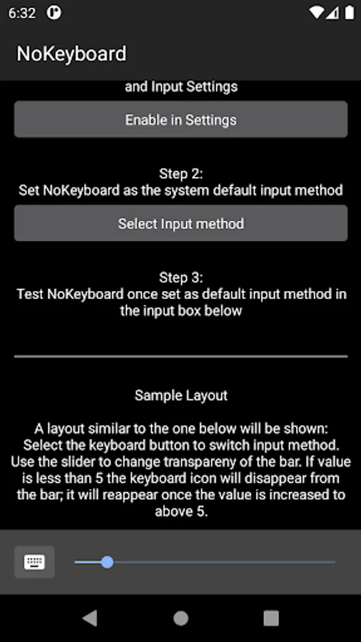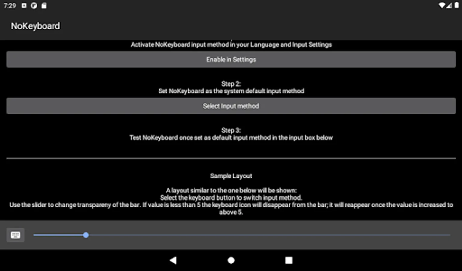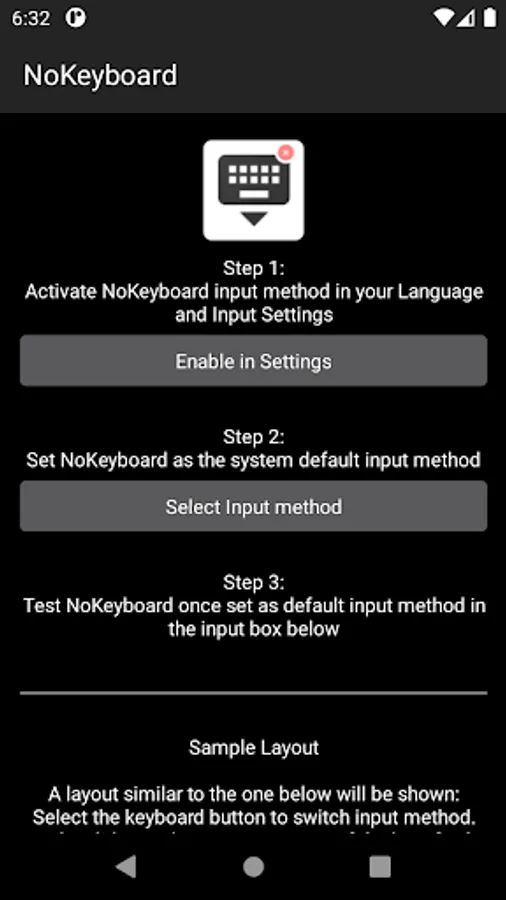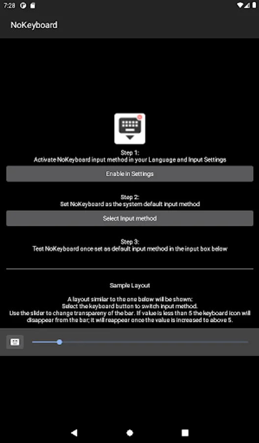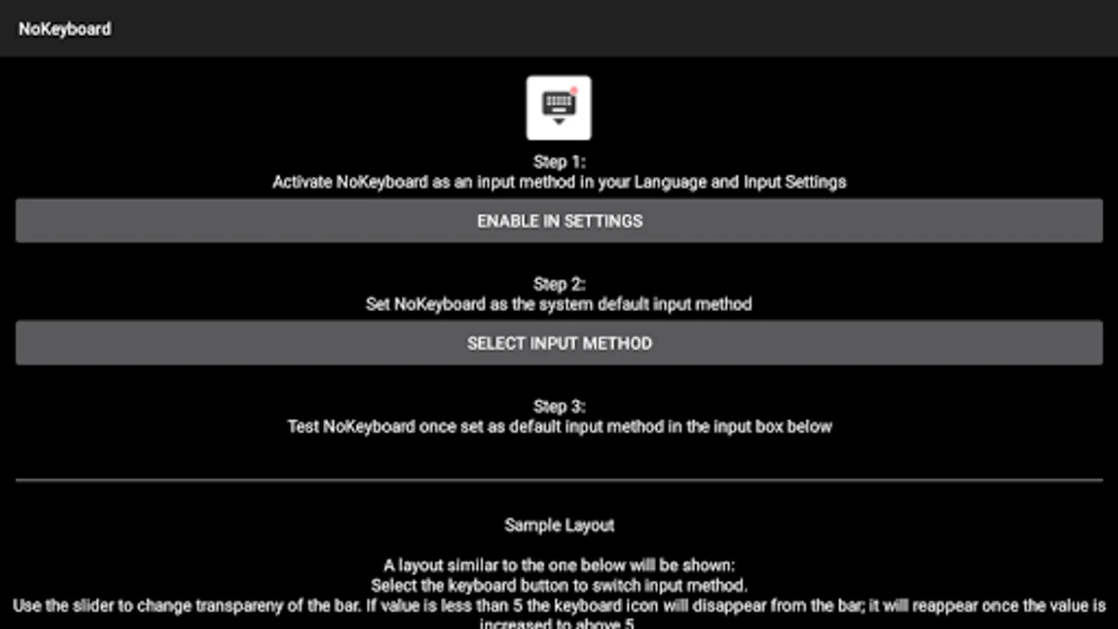 ✓Easy to setup just open the app and select keyboard settings and enable No Keyboard.