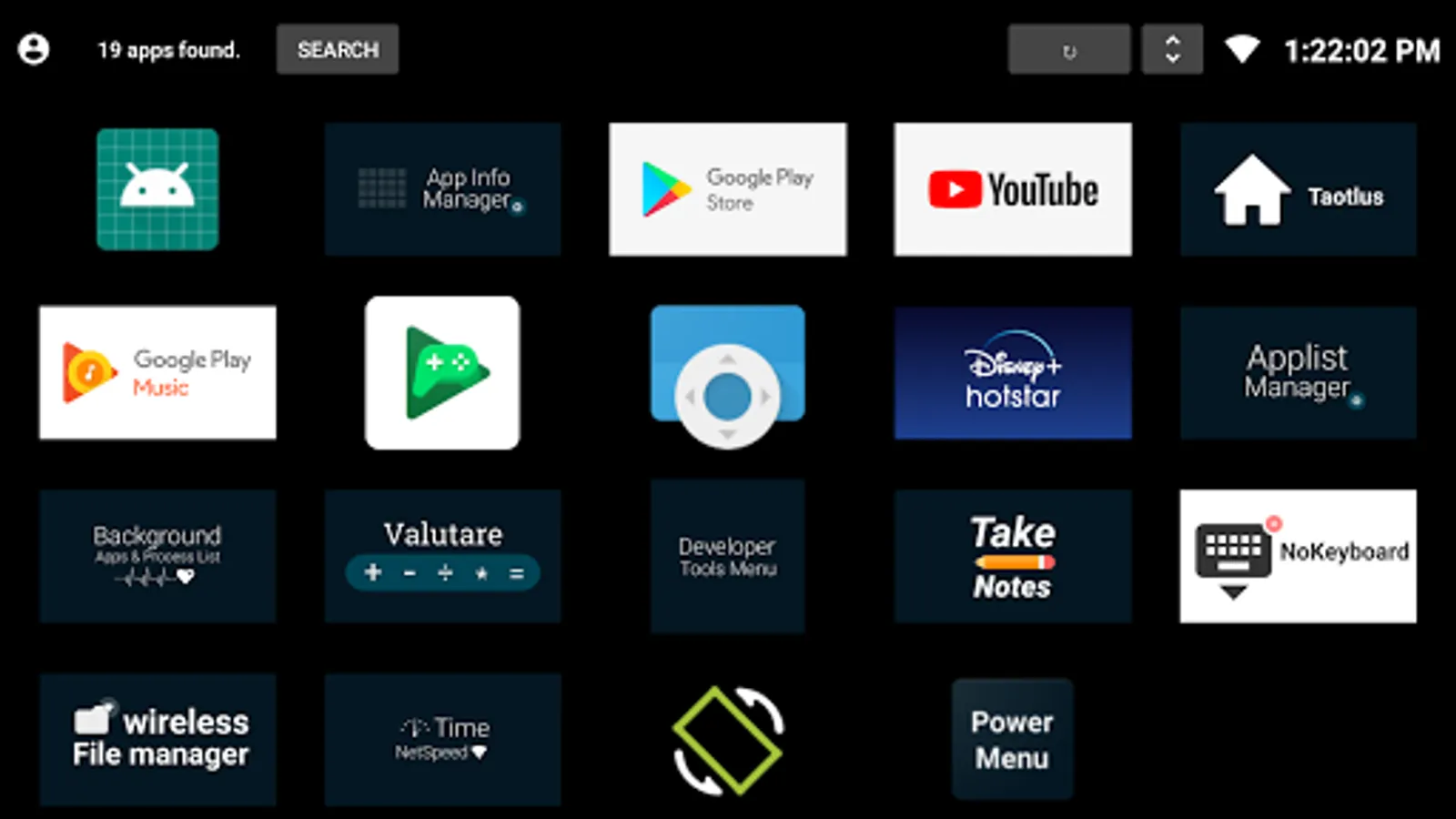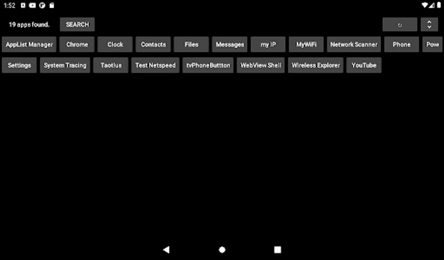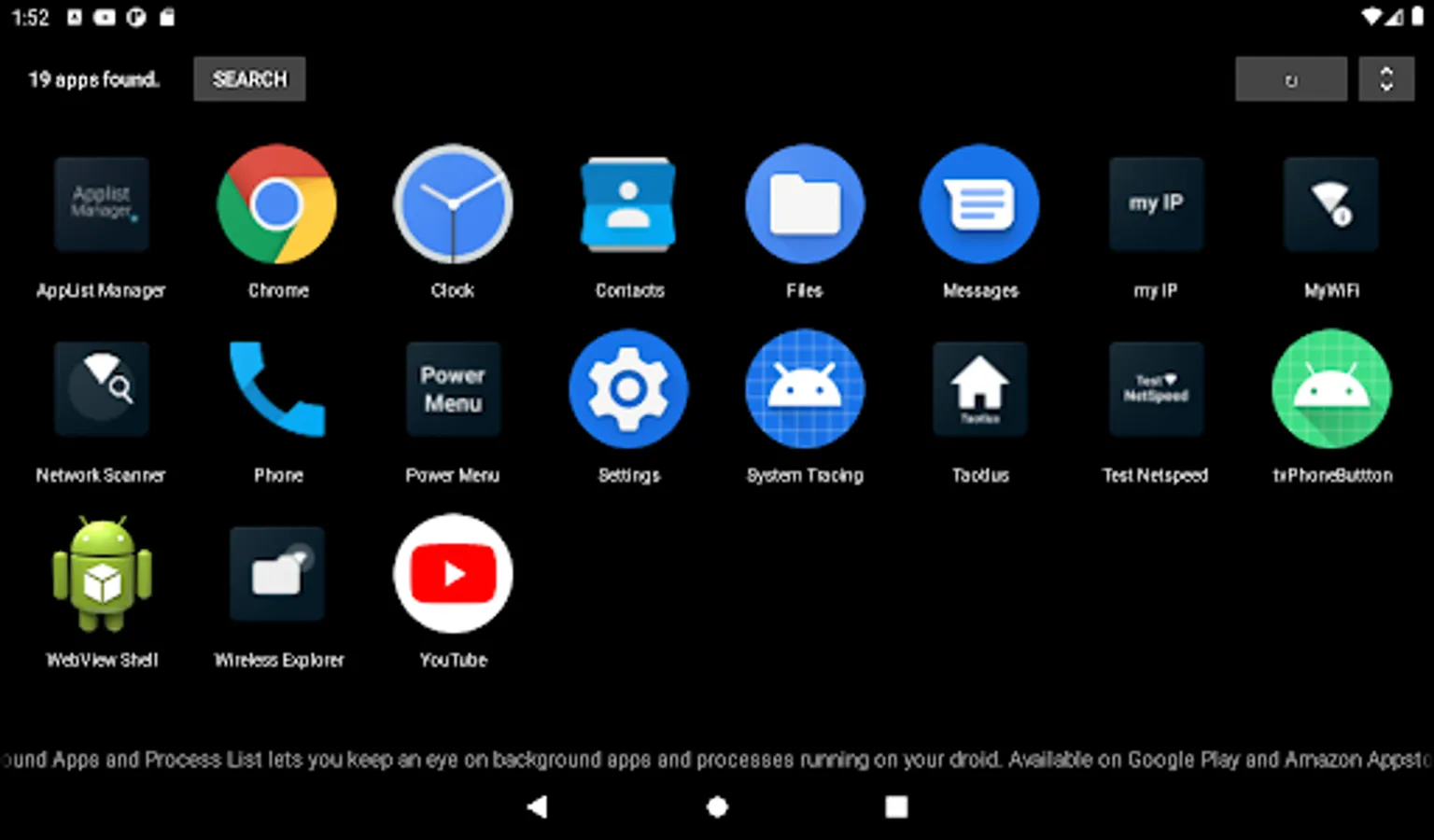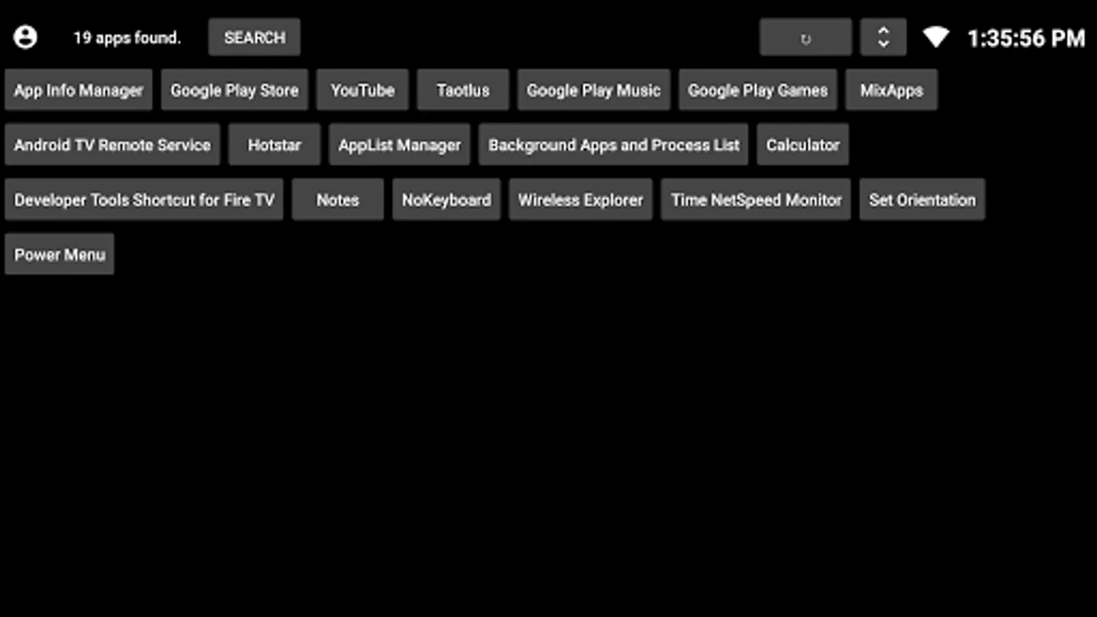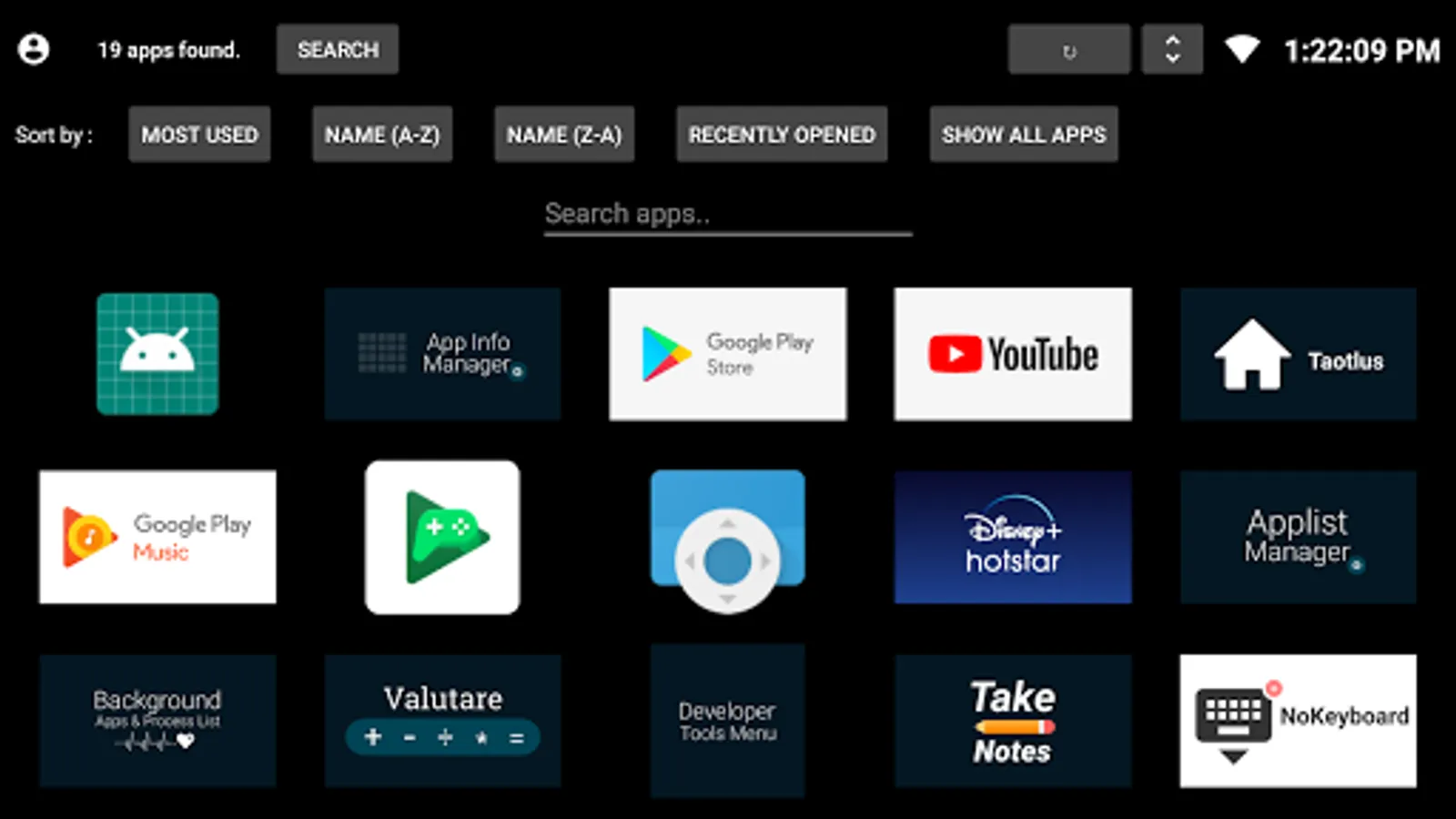 Taotlus lists all apps installed on your device; including side loaded apps; can be used as a Launcher if required.