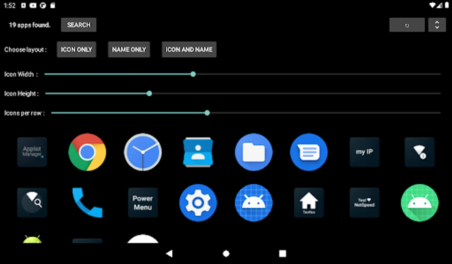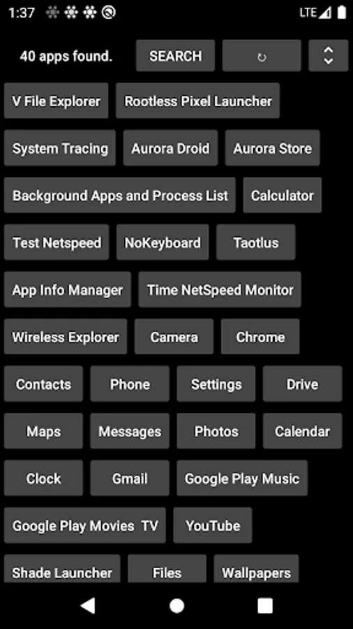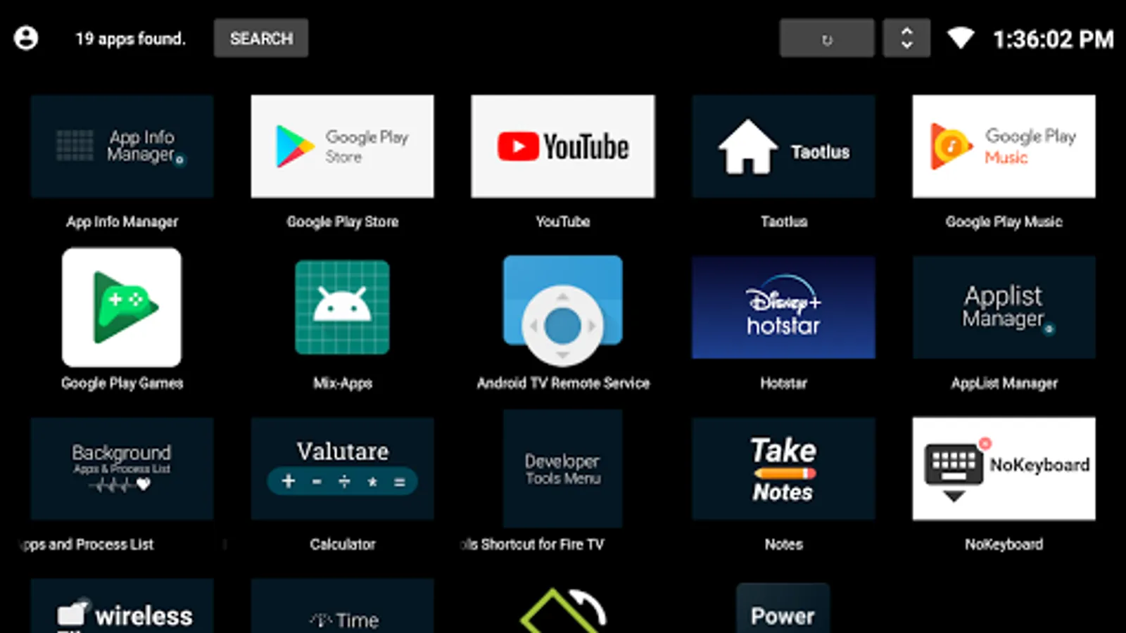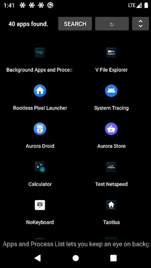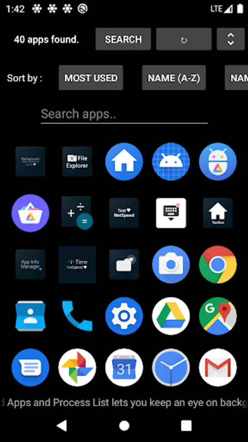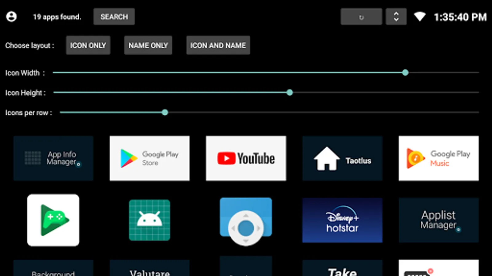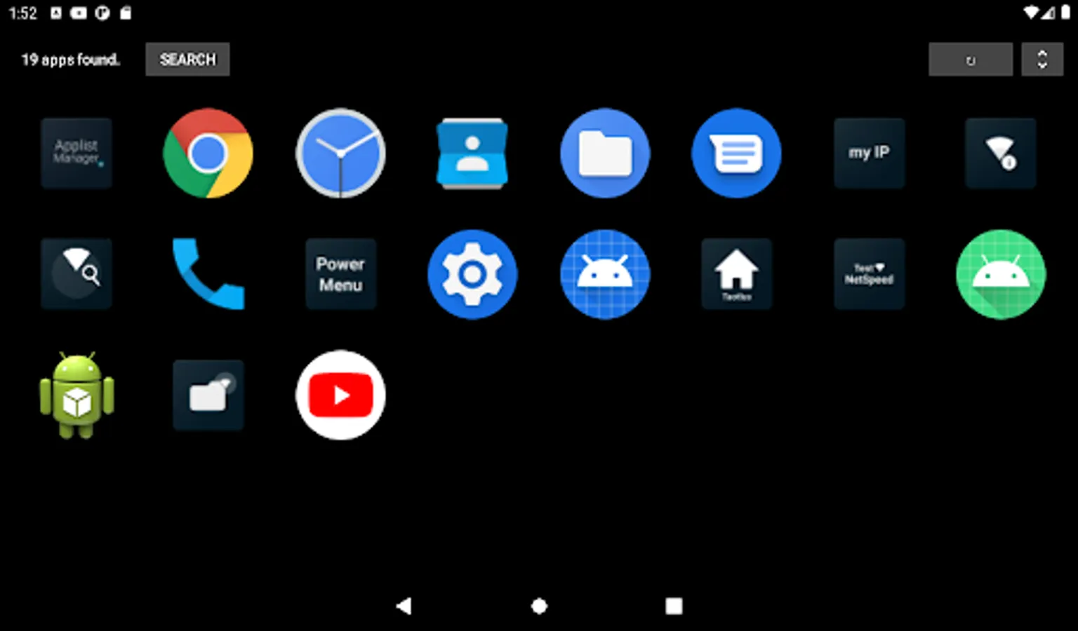 Taotlus lists all apps installed on your device; including side loaded apps; can be used as a Launcher if required.