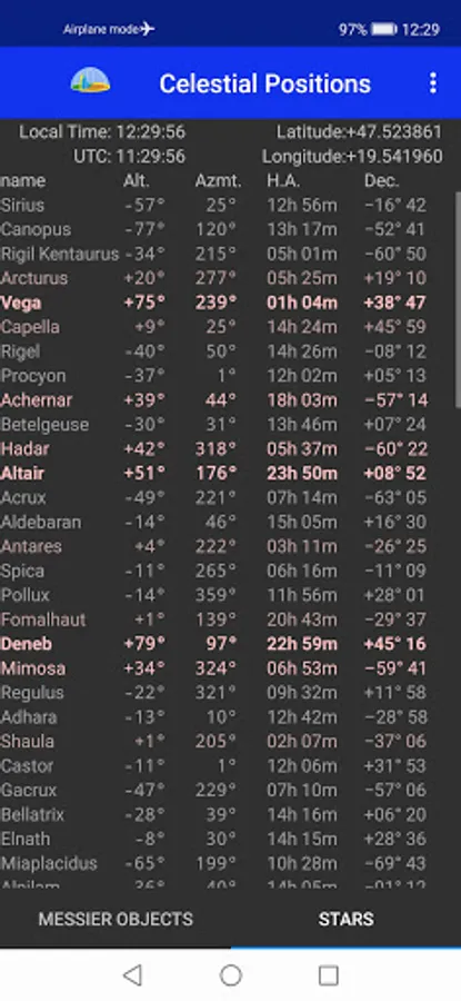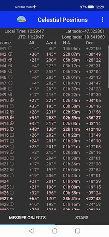 The celestial positions of all Messier's objects and bright stars are calculated every second to display the list of them.