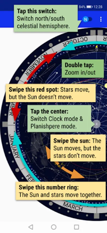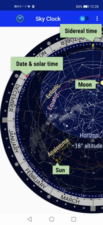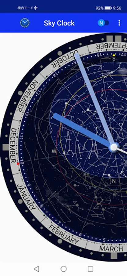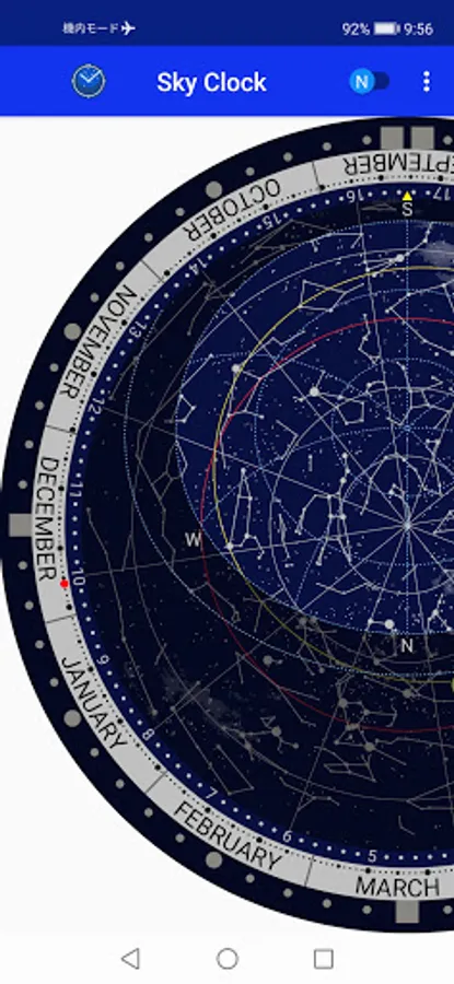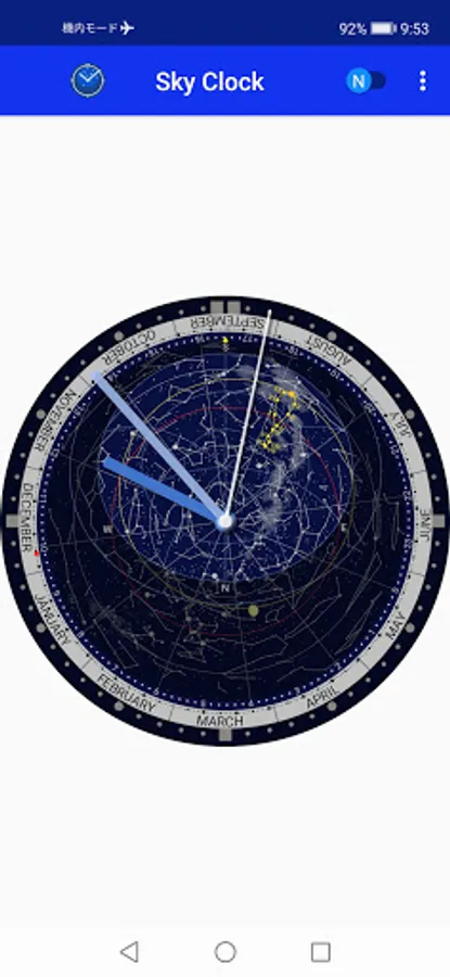 This is a clock application with a planisphere for Android. The planisphere shows the current sky at the observation location by setting the latitude and the longitude. You can switch the northern and southern celestial hemispheres. The application name was changed in April 2023.