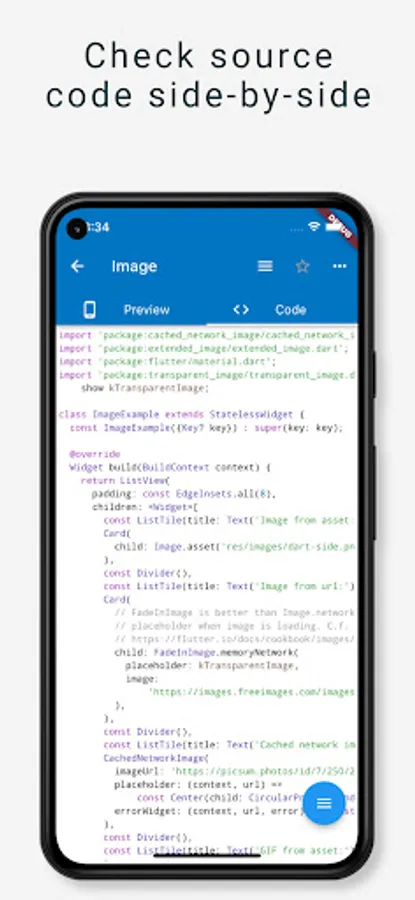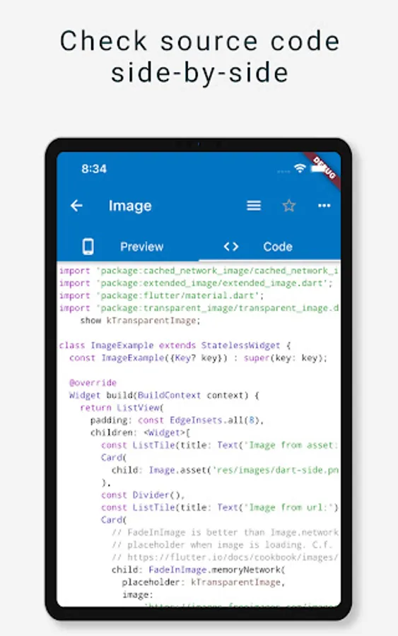 An opensource app showcasing Flutter components, with side-by-side source code view.