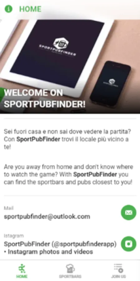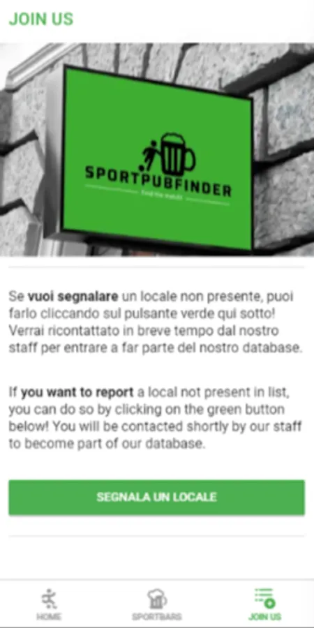 With Sport Pub Finder you can find sportsbar and pubs that broadcast sporting events worldwide. If you own one of them or simply want to report a new pub, you can do it through the form available in the App.