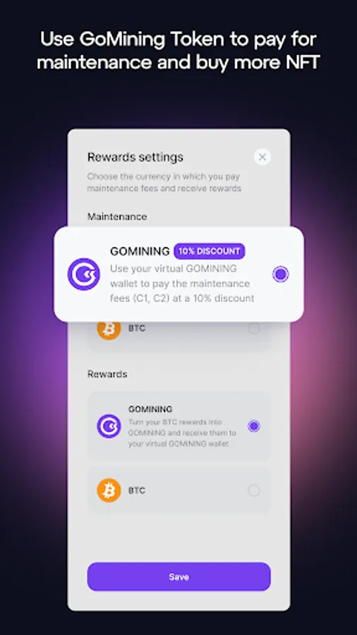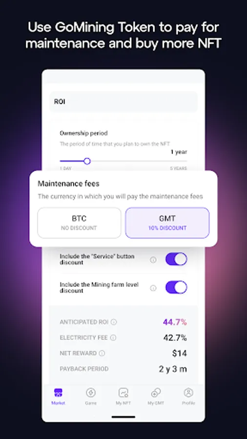 Our discount system will also help you increase your payouts. Just use GoMining tokens to pay for gaming functions and NFT maintenance, and your final mining rewards can grow up to 30%.