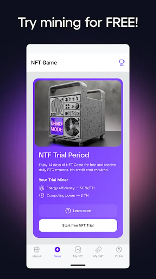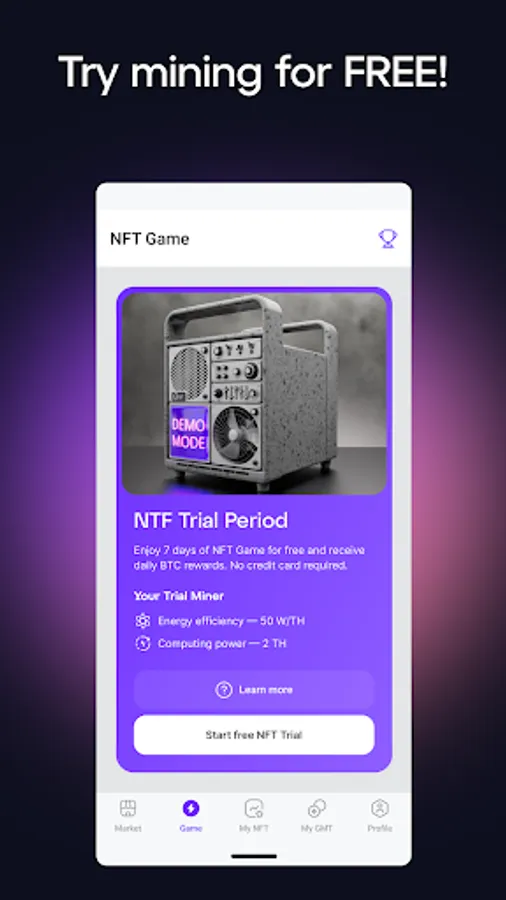 Take advantage of our trial period. For a week, you will be provided with an NFT miner for free, which will bring in the first BTC the next day. At the end of the trial period, you can either redeem it and take all the rewards, or do nothing. We will give you six months to think, after which the mined BTC will be burned.