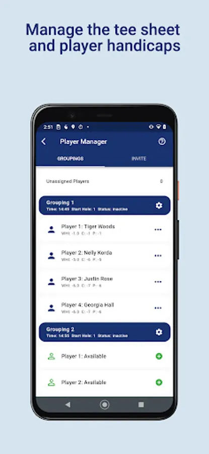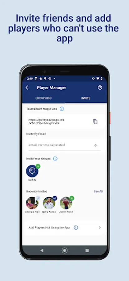 Anyone can create competitions in just a number of seconds. Choose from a number of game modes and over 24,000 courses worldwide. Invite players to join the competition, or add them as inactive users. There only needs to be one active device per a group to score. This is perfect when you have players who don’t want to use the app.