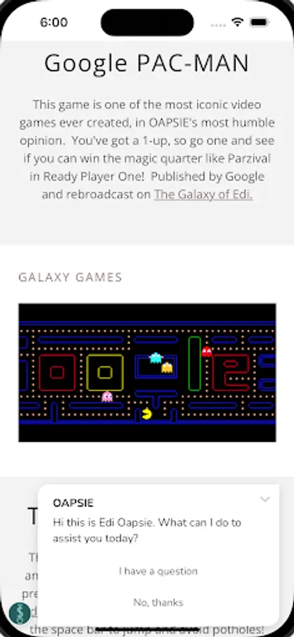 Galaxy Games is a platform for distribution of OAPSIE Originals Games and public domain, old school arcade type games. New games are being continually added.