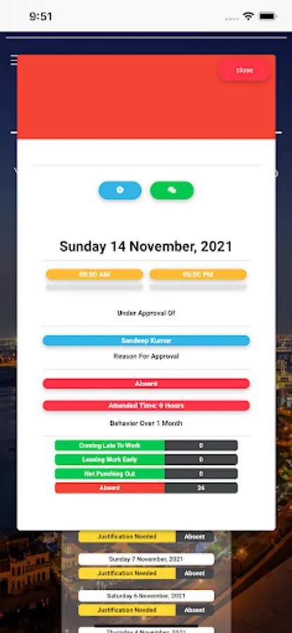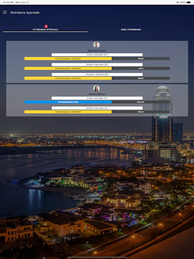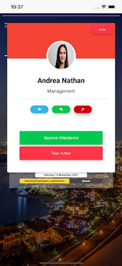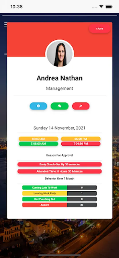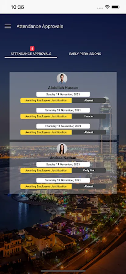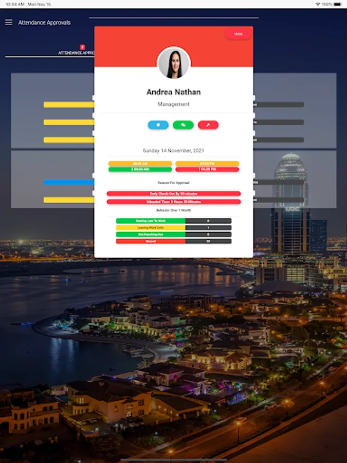 Approvals are also available through the app, by which the direct manager can approve or reject an attendance. These approvals are determined by the system based on the Shift-Start time of each employee, working hours, missed check-out, etc...