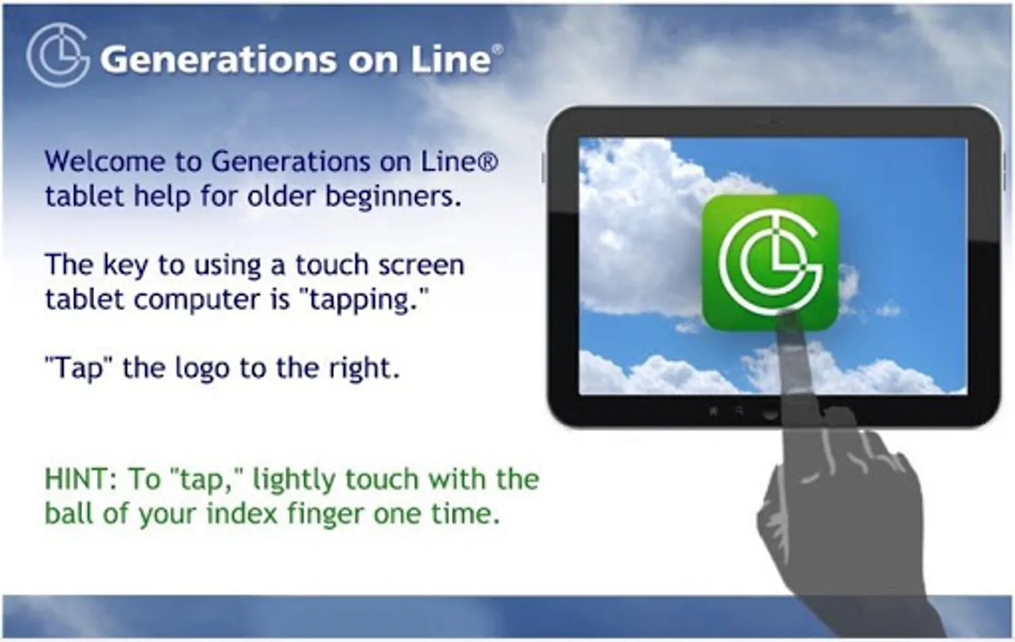 GoL Tablet Edition is an app expressly for older adults who are brand new to the world of the Internet. The GoL teaching app guides the new user through a series of hands-on, interactive, step-by-step instructions to develop basic tablet skills, followed by practice exercises for specific popular tablet functions. Self-learning, by proceeding at their own pace, the new users learn by doing – with instruction that lead to Internet applications – email, web searching, YouTube, as well as tablet tools such as using the camera, texting, and video calling.