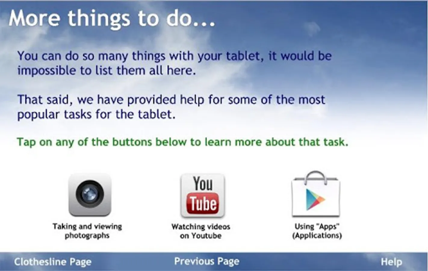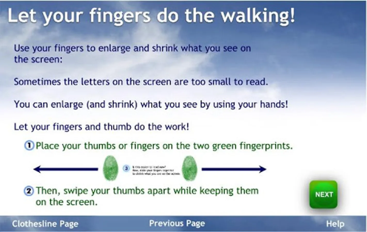 - We provide instructions on every screen so the user never has to worry about forgetting. From learning how to “tap” to learning how to download a new app, the user is guided through the process with step-by-step instructions.