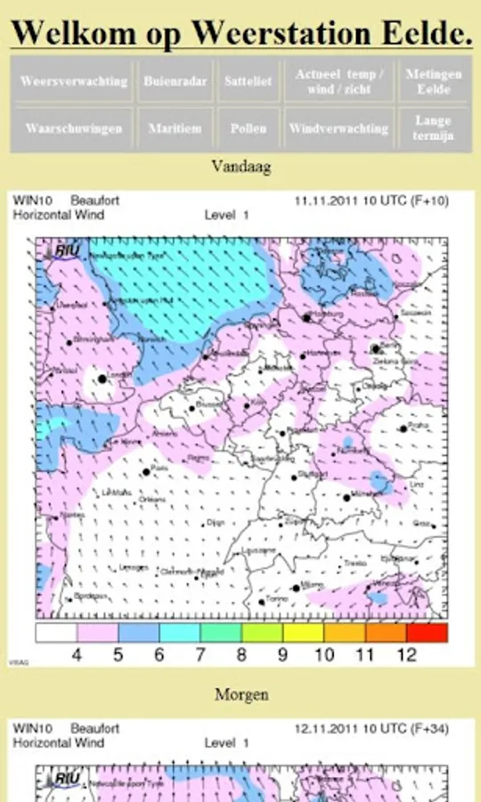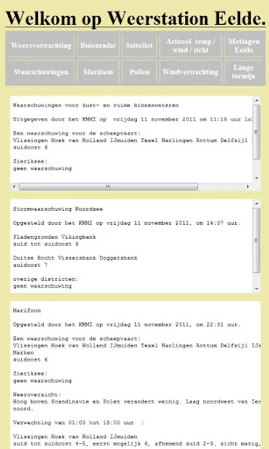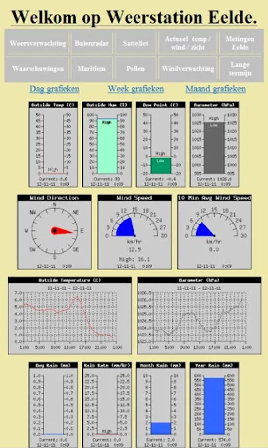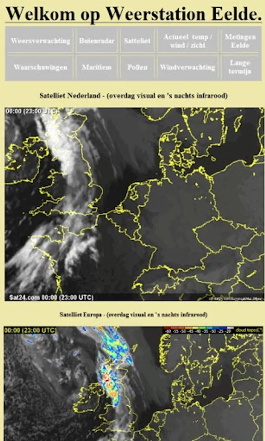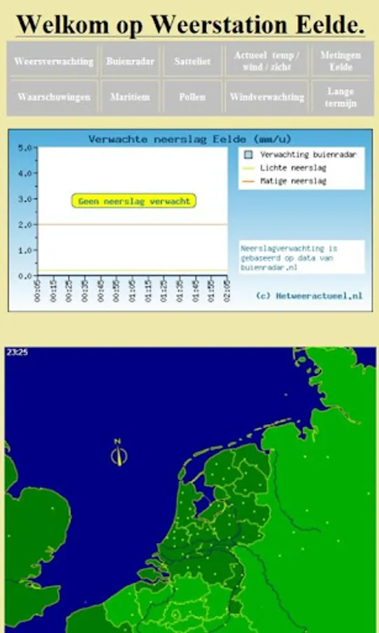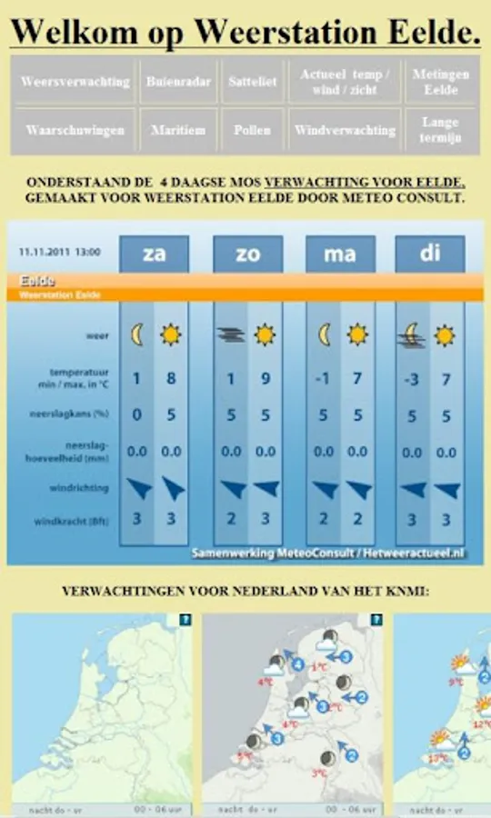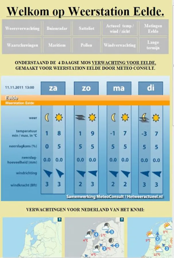 The new mobile site weather-yellowed as an app with lots of weather information including radar, satellite, current temperature, wind and visibility, maritime weather and tides, wind forecast, weather alerts and current and historical measurements of weather station Eelde.