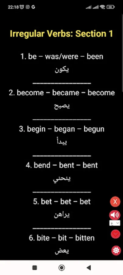 Comprehensive database: The application contains a detailed database covering more than 200 irregular verbs translated into Arabic.