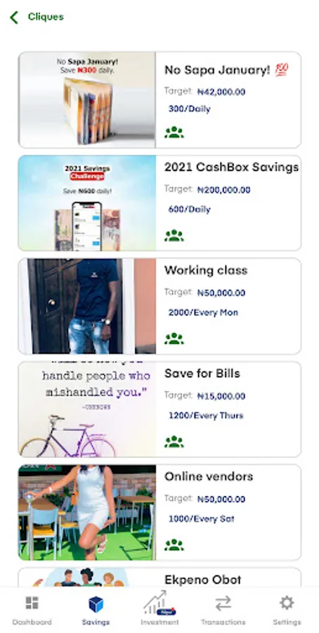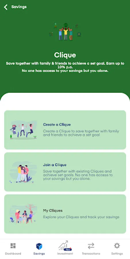● Cliques: Save together with family & friends to achieve a set goal. Even though savings is done together, no one has access to your funds but you alone.