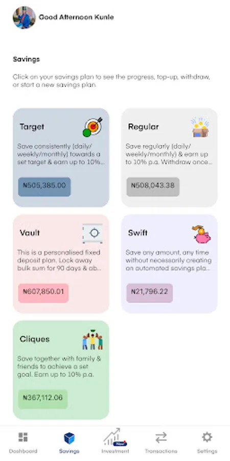 ● KidsBox: Our KidsBox feature is curated for kids of all ages. It’s a fun and educative way to introduce kids & teens to money. Parents can also use this feature to save for their kids. Jump right in and start saving for the future.