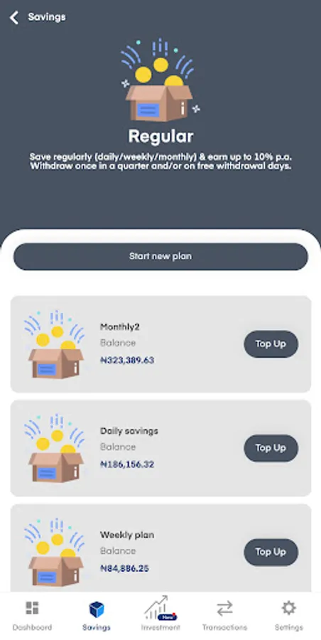 ● Regular: Auto save regularly (daily/weekly/monthly) and also earn interest on savings. Withdrawal is easily done on your set free withdrawal days which is once in a quarter and any other one time within the quarter.