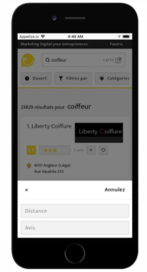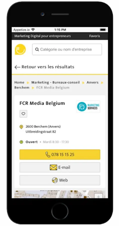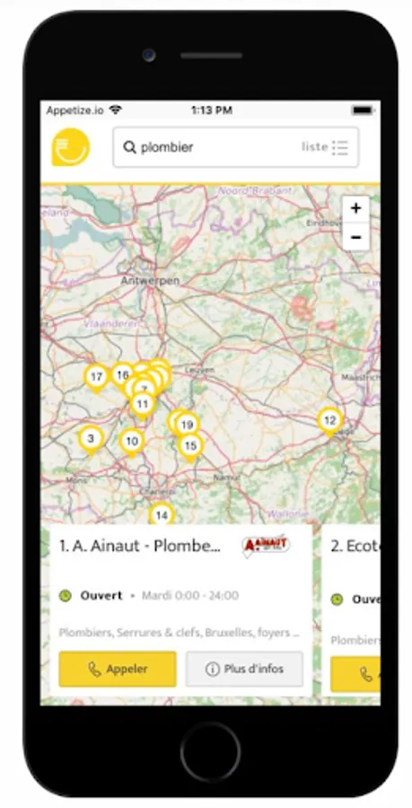 The goldenpages.be application will allow you to discover hundreds of thousands of companies all over Belgium. And this, for all sectors of activity. You introduce a name or a job (possibly the place or the postal code) and you discover your good addresses available. Of course, you can filter by distance or reviews. By clicking on a company, you will find the address, the schedule, the telephone number, the e-mail and the website as well as the location on the map. You will always find a trader or contractor near you!