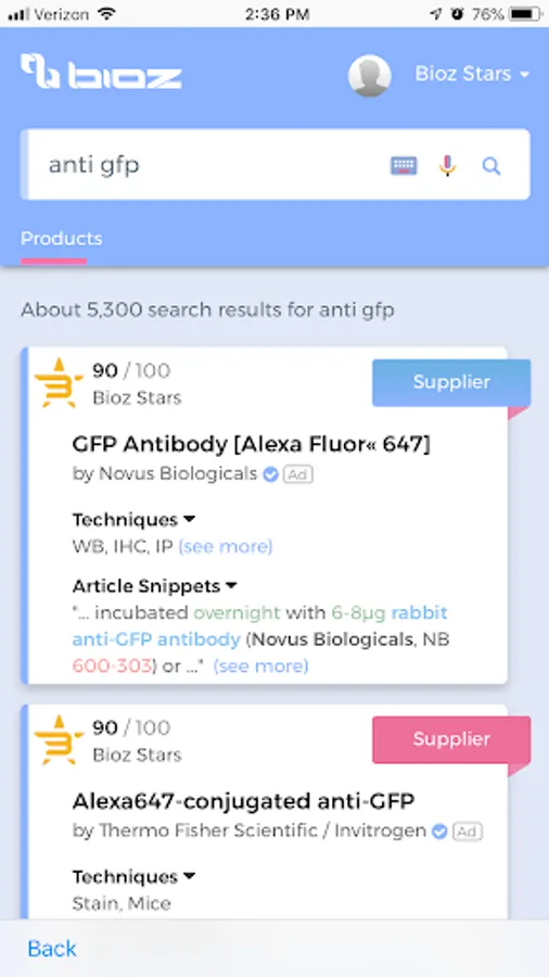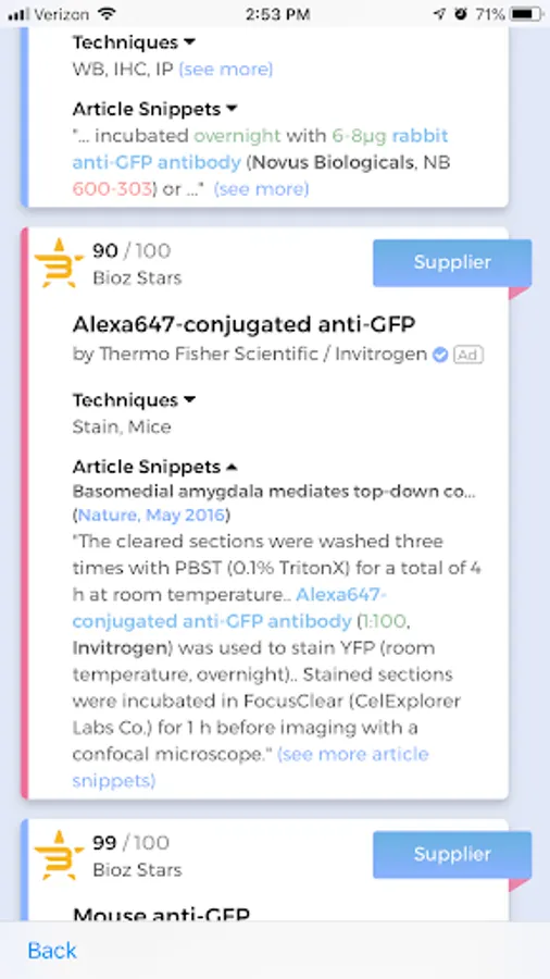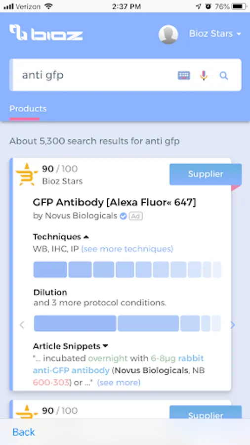 Join 1+ million researchers, including 3 Nobel Laureates - If you are a scientific researcher is academia or biopharma, Bioz is your resource for deep article-based experimentation knowledge. Bioz uses advanced A.I. to analyze and structure data from within the materials and methods sections of 27 million peer-reviewed articles. On Bioz.com, you can view objective ranking scores, article snippets, techniques, protocol conditions, and more, for 300+ million reagents, kits, assays and instruments. Bioz is the world's largest and most comprehensive scientific recommendation engine, and is FREE for all researchers. Download the Bioz app today, and start to Bioz It!