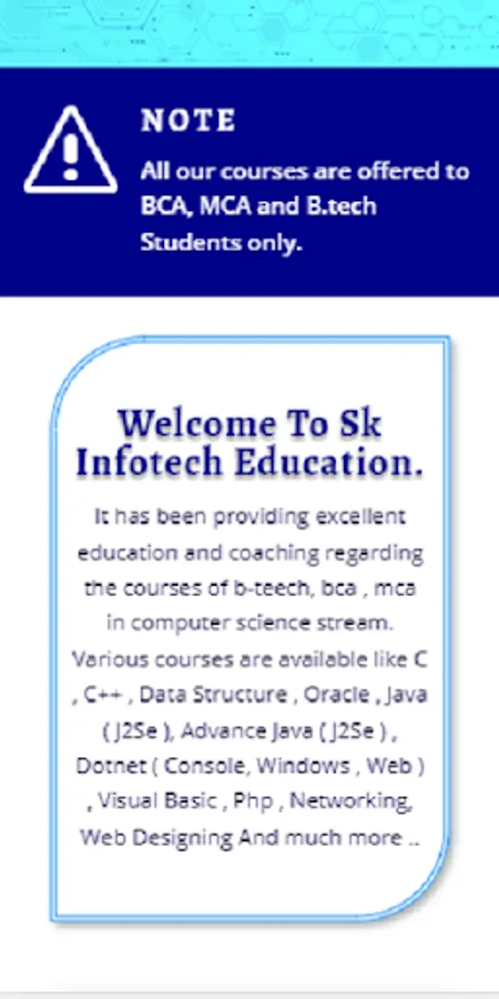 We also provide C, C++, CORE JAVA, ADVANCE JAVA, COMPLETE.NET, PYTHON, ORACLE, PHP, MYSQL and ANDROID to btech students