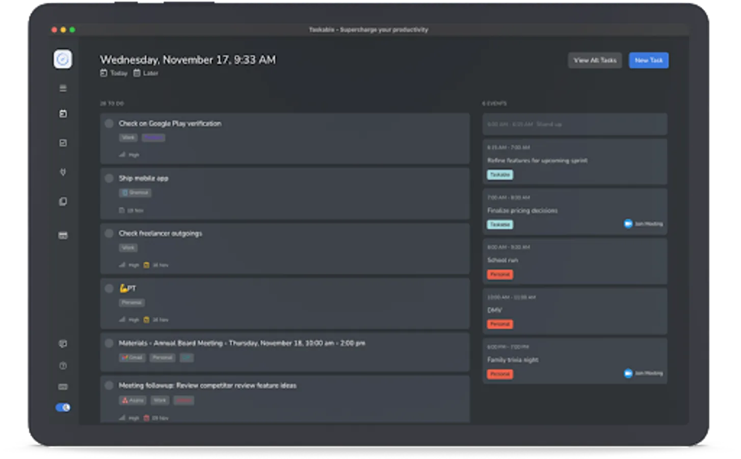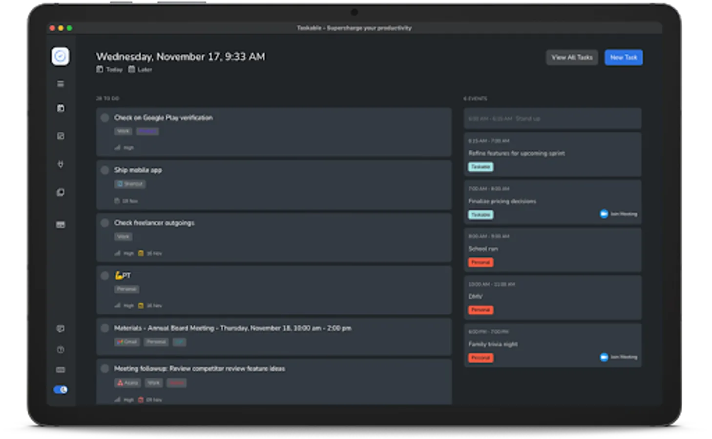 Using multiple work apps leads to tons of context switching, breaking flow and killing productivity. Taskable is a smart to do list and productivity assistant. Bring tasks, calendars, & context from across apps into one view so you can search less and do more.
