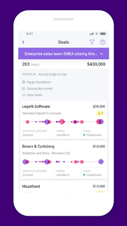 - Deals on Mobile: easily see all of your team’s deals, and tell at-a-glance which are on pace to close, and which need your attention