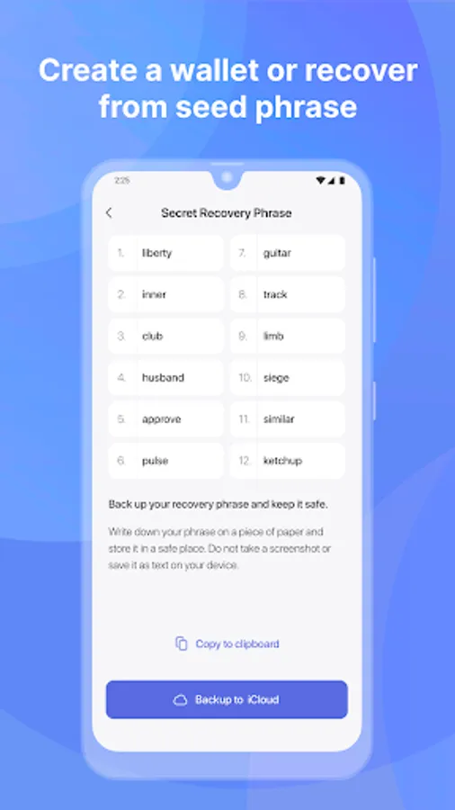 - Non-custodial wallet app (you control your keys), generate passwords and keys on your phone and keep your account safe.