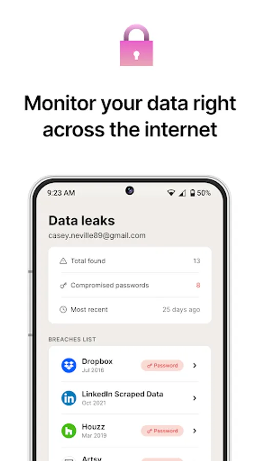 It all starts with data leaks. Guardio searches all corners of the internet, including the Dark Web, for your data. If we find it’s been leaked or exposed somewhere it shouldn't be, we let you know immediately. This gives you crucial time to protect or update your most sensitive data - passwords, credit cards, etc - before the bad guys can sell it. This is how you stay safe from identity theft.