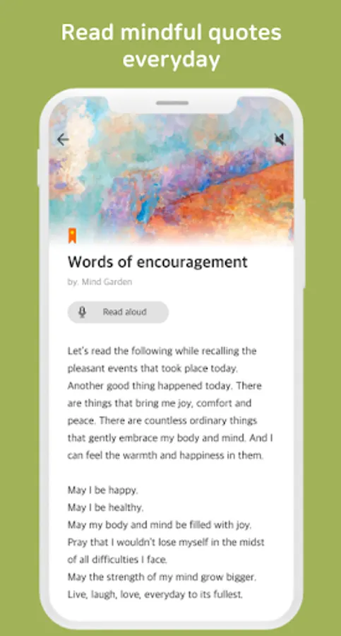 Read mindful quotes and listen to them with a comforting voice of yours. Mind Garden will guide you through the journey of finding the calming tone of voice. When you take a stroll in the Mind Garden, you will come upon scripts that are based on Acceptance and Commitment Therapy and Self-affirmation. Taking a Mind Stroll helps you see your anxieties and depressed thoughts from a new perspective, and let you stay resilient throughout the day!