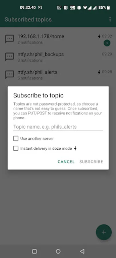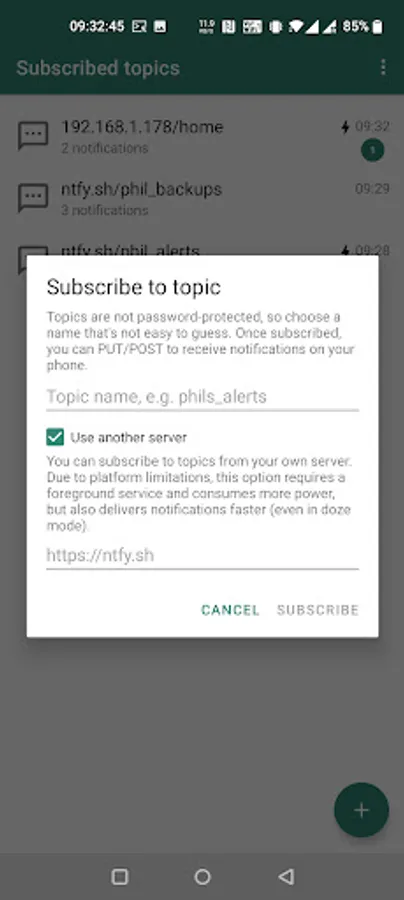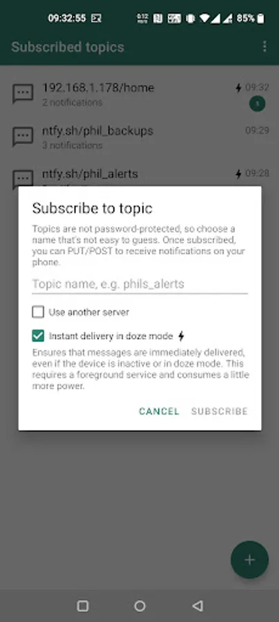 ntfy is an Android client for https://ntfy.sh, a free and open source HTTP-based pub-sub service. You can subscribe to topics in this app, and then publish messages via a simple HTTP API.