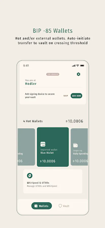 * All that you will need for securing your bitcoin: BIP 85 hot wallets, auto-transfer to vault, buy bitcoin directly in to your cold storage, and much more