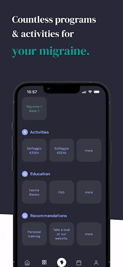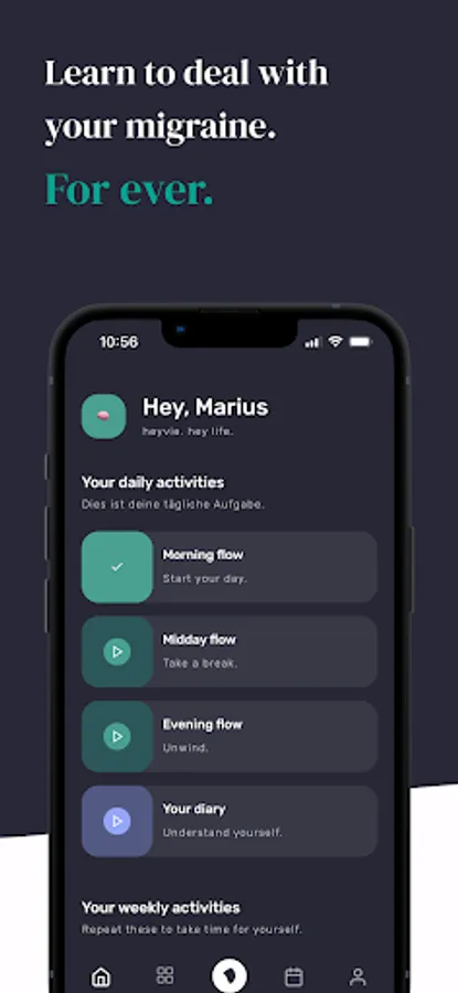 The heyvie app is your digital migraine coach: use a neurological program, a migraine diary und many more pieces of content to change the ay you think, feel and act about your migraine. You will learn to deal with your migraine long term and find the exercises, that really benefit you.